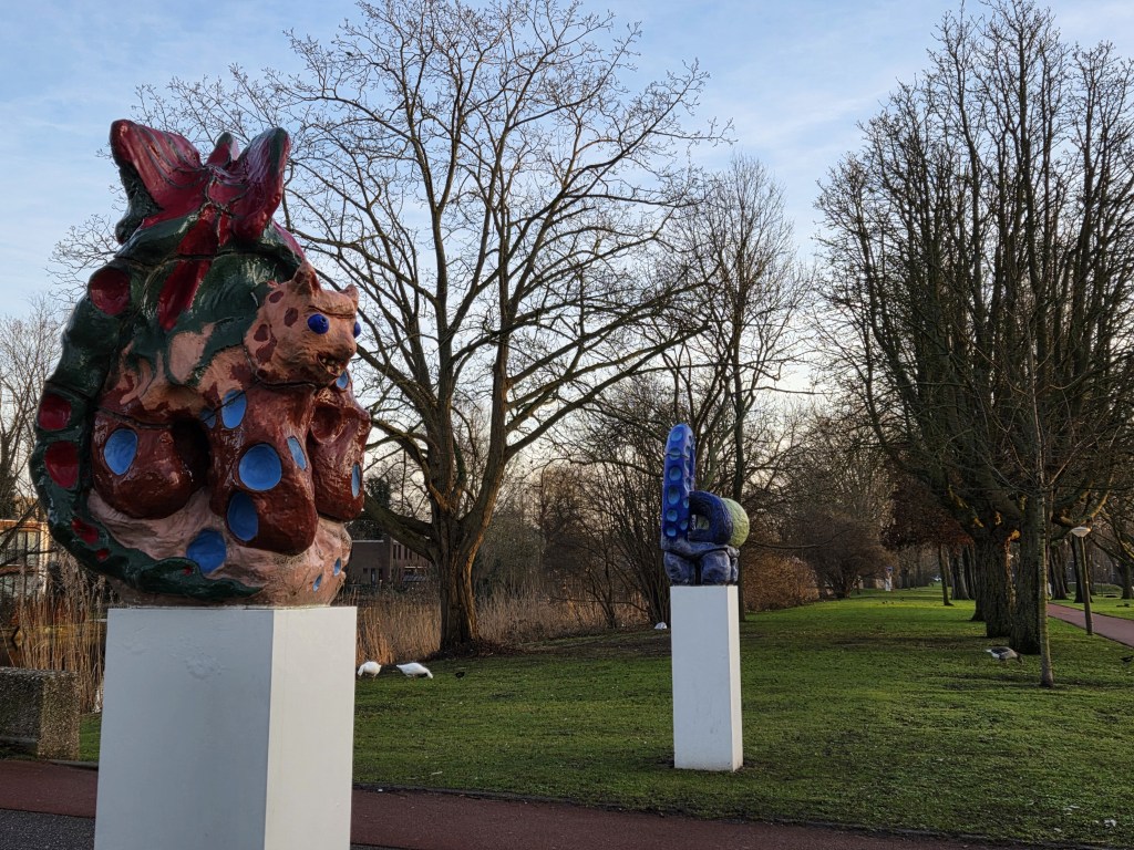 Yes, these are both a bit of a stretch, so we’ll rest this series ’til I’m around more legit art in nature again. Above left, nature outside at the far end of one of the galleries from the Kröller-Müller in Hoge Veluwe, and right an artistic spider web and spider in a window at the fort in Pannerden. The sign says “warning, might bite,” but of course it’s an arts & crafts project very possibly made by a kid – it’s a very kid-friendly fort with lots of activities going on.