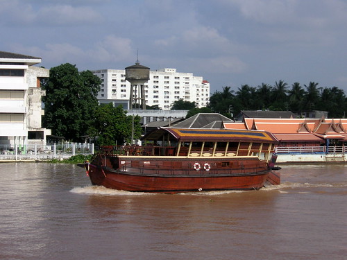 Ayuthaya and Bangkok are both on the Chao Phraya river — Ayuthaya perhaps 100 kilometeres upstream from Bangkok, and Bangkok less than 100 kilometers up from the Gulf of Siam. We took an early morning bus up to Ayuthaya, but took a leisurely lunch cruise down the river coming home. We saw dozens of children swimming in the river and jumping from trees down into the river;we saw temples and places of worship that we lost count of. We saw the life of a river that’s clearly a vital link in the life of this part of the country. Here you see a lovely boat that I think is used for tourism; in later photos you’ll see other boats for more blue collar uses, and various shots along the main river upstream from downtown Bangkok.