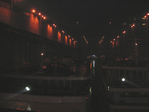Sorry for the fuzziness of these two shots, but they’re the best I could get. The ill-lit nighttime one shows is taken from our boat, showing all the other boats being shoe- horned into the second (of five) locks of the Three Gorges Dam, at around midnight on the last night of our cruise. Many of us stayed on deck the whole time to watch the process. It’s amazing. It’s now three weeks later, and I didn’t take notes, but if I recall, each lock raises or lowers ships about 22 meters or so, and they’re one after another. Right now, the first lock is not yet functional since the water level has not risen above the level of the second lock yet. Anyway — it was intensely cool, though in an industrial sort of way, not in the beautiful nature of the gorges sort of way. The really fuzzy shot is from the bus after we’d toured the Dam and learned more about it. It shows the step-like progression of the five locks, from outside and downstream.