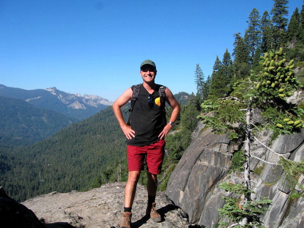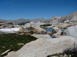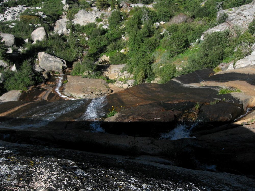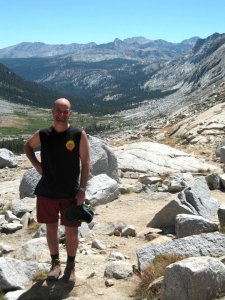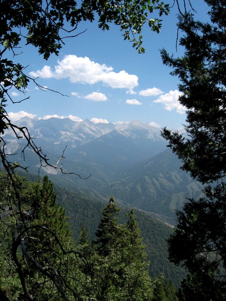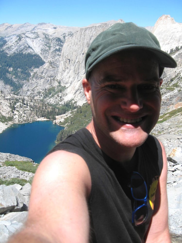 Having added that LA leg, I then signed on for a sojourn in Sequoia National Park, the less-visited and somewhat less-known southern neighbor to California’s blockbuster Yosemite National Park. My friends Howard and Gene, along with others whom I enjoyed meeting in the park, had arranged three out of six tent cabins at Bear Paw high sierra camp for a few nights, which dovetailed rather nicely with the wedding: I got myself up to Sequoia with help from Gene, we hiked the eleven miles up to Bear Paw, and spent two nights there before hiking the eleven miles back down. In between, I did an absolutely amazing 16-mile hike with 4500-foot elevation gain going up and then back down, up to Mt. Steward on the Great Western Divide (the crest of the Sierras). The higher alpine-tundra looking shots below and above are from that day’s hike, with high alpine lakes and so forth. The rest are generally shots of the Sierras in Sequoia, including a shot of me in front of one of the big, wide redwoods that give Sequoia its name. Believe it or not, I’ve actually sorted through these shots and excluded many from this entry — still and all, there are a lot of shots, but I hope you’ll agree they’re worth enjoying. 🙂