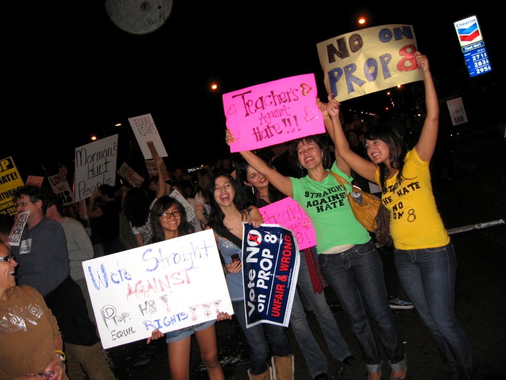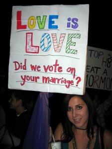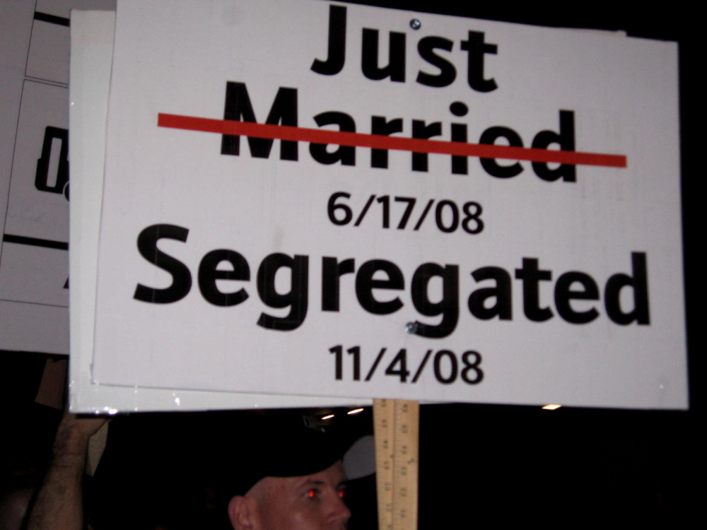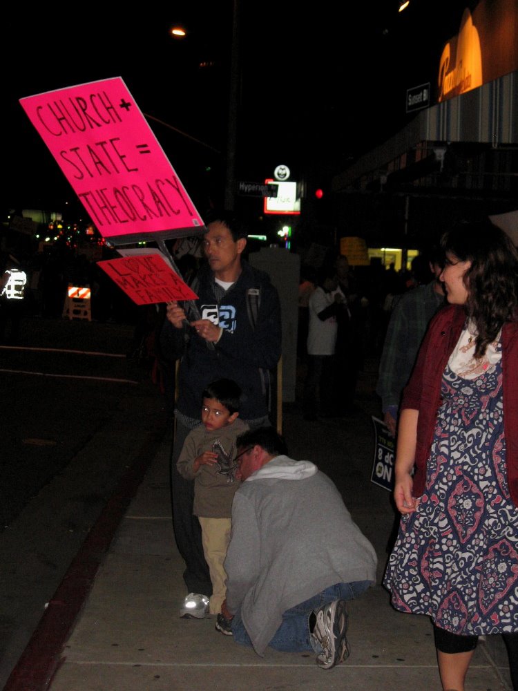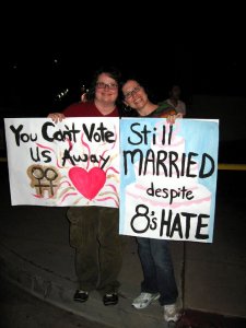 California, as many even outside the US are now aware, was the scene of perhaps the most disappointing electoral loss for the equality-minded on that night of otherwise glorious and liberating news for us all: by a simple majority on a ballot measure, the California state constitution was amended to eliminate equal access to marriage for lesbian and gay people — thereby relegating us to second-class status, even within California which has a good civil-union law for us 2nd-classers, let alone in other states whose laws are far more restrictive and discrimatory — not to mention federal laws which take no account of our families and relationships, whether for taxes or immigration or any other civil matter . Fired up by our disappointing loss, progressive spirits of all stripes (not just the LGBT community by any means) have begun to organize and try to reach out to those who voted in favor of restricting equal rights. There are many reasons we lost on this ballot measure and thus lost our equal rights — we didn’t reach out enough to religious and other communities who feared that our equal rights might infringe on their free practice of religion (whereas the campaign in favor of restricting our rights played actively on that fear among religious communities, and was very strongly funded by members of both the Catholic and Mormon churches), those of us who might have devoted more attention to education and outreach about the issue were focused on work, our economic and career fortunes, or trying to get a responsible and honorable president elected for the first time in this millennium. Be that as it may, we have some catching up to do.