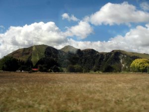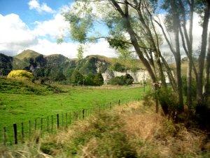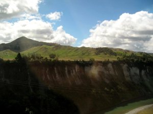 From Wellington I headed north to Tongariro National Park…pics of which you’ve already seen because, well, it’s just more interesting, now isn’t it? 🙂 This was the first time I got to take the train here in NZ and I was charmed: the rail is all narrow-gauge, so the trains are a bit narrower to begin with than in Europe or other places I’ve gone by train. But one must also remember it’s NZ: and this often means many things, among them small, well-done, friendly, generally adorable and wonderful, and without a lot of choice often. There are, by my count, six long-distance passenger trains per day in NZ: one northbound and one southbound between Wellington & Auckland (The Overlander, pictured above in Ohakune Station on the southern edge of Tongariro Nat Park) — this one has four passenger cars, one of which includes the cafe/bar car, as well as an engine and a baggage car. The northbound and southbound crews switch trains at the midpoint, usually at or near National Park (a town that exists for the train, and where I stayed during my lovely Tongariro journey), which allows them to be home for the end of the day. How adorable is that!? Other long-distance trains: between Picton & Christchurch, covering the northern half of east coast of South Island; and between Christchurch & Greymouth, diagonally across some of the mountains on South Island. I assume those, also, go once each day, but I don’t know. I recommend train travel in NZ: it’s friendly and though it covers only a small part of the country, it’s comfy and gives great views. Some of these are below…please pardon the occasional window glare.