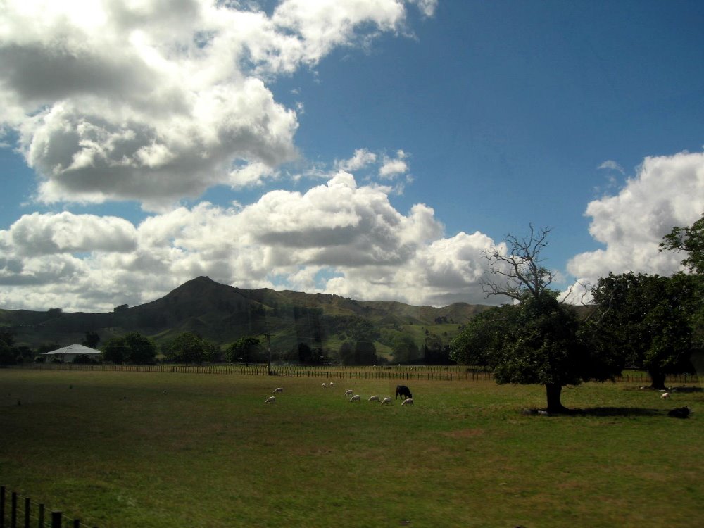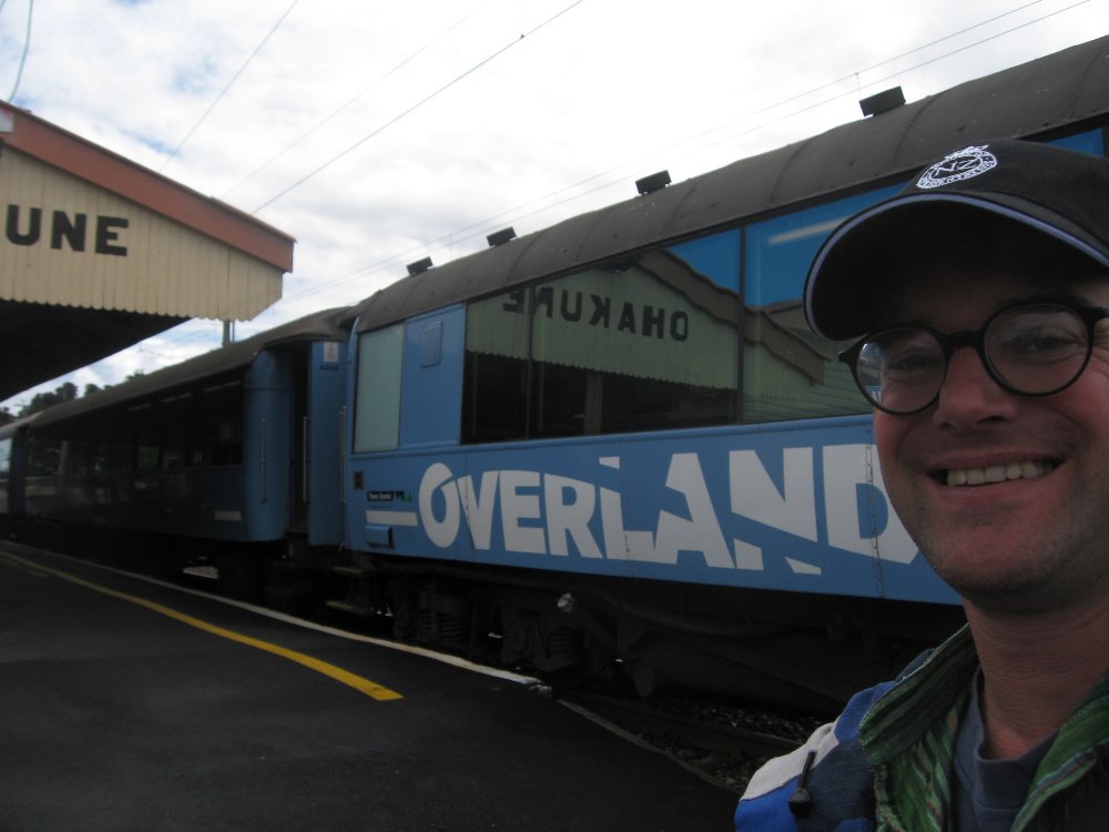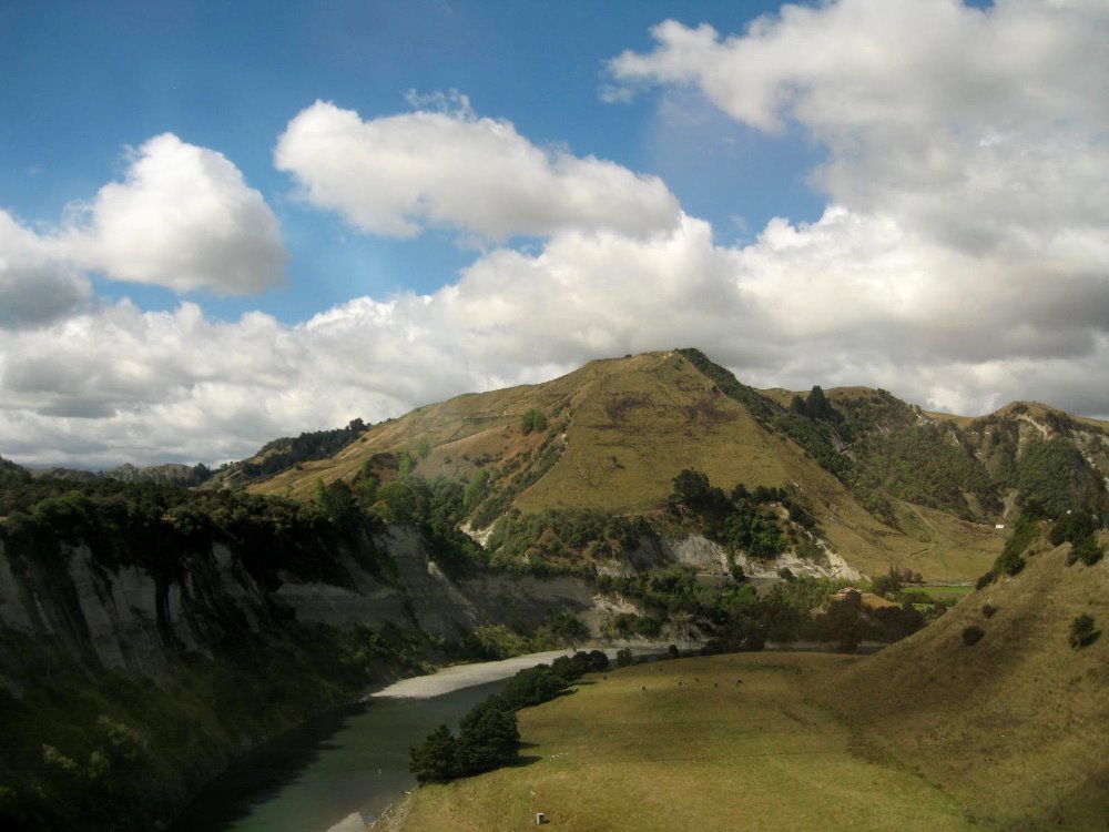From Wellington I headed north to Tongariro National Park…pics of which you’ve already seen because, well, it’s just more interesting, now isn’t it? 🙂 This was the first time I got to take the train here in NZ and I was charmed: the rail is all narrow-gauge, so the trains are a bit narrower to begin with than in Europe or other places I’ve gone by train. But one must also remember it’s NZ: and this often means many things, among them small, well-done, friendly, generally adorable and wonderful, and without a lot of choice often. There are, by my count, six long-distance passenger trains per day in NZ: one northbound and one southbound between Wellington & Auckland (The Overlander, pictured above in Ohakune Station on the southern edge of Tongariro Nat Park) — this one has four passenger cars, one of which includes the cafe/bar car, as well as an engine and a baggage car. The northbound and southbound crews switch trains at the midpoint, usually at or near National Park (a town that exists for the train, and where I stayed during my lovely Tongariro journey), which allows them to be home for the end of the day. How adorable is that!? Other long-distance trains: between Picton & Christchurch, covering the northern half of east coast of South Island; and between Christchurch & Greymouth, diagonally across some of the mountains on South Island. I assume those, also, go once each day, but I don’t know. I recommend train travel in NZ: it’s friendly and though it covers only a small part of the country, it’s comfy and gives great views. Some of these are below…please pardon the occasional window glare.