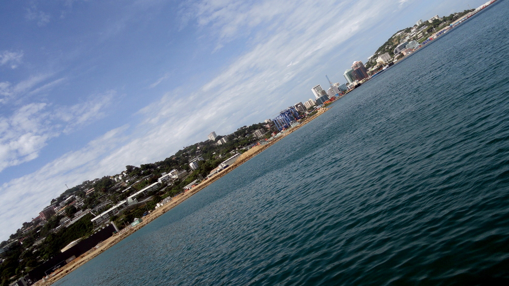 …below, the containter port in the foreground, the towers of the CBD in the middle, and Ela Beach just off the frame to the right.