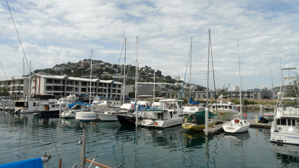 Today marks exactly two months since I landed in Port Moresby, so in honor of my lovely new home I thought I’d quickly answer the request from some of you for more photos of the town itself. All but one of these photos were taken this morning when I met a friend for breakfast at the yacht club (yes, I know) then had a lovely walk around the boat basin, watching sailboats come in and out, the scuba club getting ready to head out for some scuba around the harbor, and so on. As you’ll see, Port Moresby is situated in a lovely area with hills, outlying islands and coastline. Directly above are the two hills of the main part of town with the tall towers of the central business district (CBD: a common term in this part of the world) in between. Like most of the cities I’ve traveled through or worked in lately, POM is also a city of contrasts – lovely harbor and hillside houses for those who can afford them, and many less-expensive settlements which are more densely inhabited and with less access to services, etc. — e.g. below, if you look closely enough, you’ll see a lot of very low-rise shacks built out onto the water itself. If you’re facing outward toward the water from where I had breaky (that’s Australian for breakfast), the shot above was to the left and the one below was to the right. For reference, the office and home between which I shuttle day to day here are on the other side of that low spine of hills in the shot below. PNG has hundreds (usual estimates say over 800) of different tribal and ethno-linguistic groups; the settlements in these urban areas tend to be mostly inhabitants who’ve moved in from other areas, typically the highlands in the middle of the island, and don’t have any traditional family or clan ties, or rights to land, here.