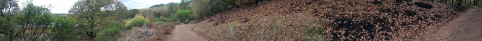 In a post last year, I did a selfie while taking a breakfast break lying on one of these two tables, at the junction of Marsh & Canyon trails. Canyon was the fire line through this portion of the park — the photo above, here, with straw over where fire fighters had widened the line is on Canyon trial, west of this point. To compare then and now, check this link or others labeled Annadel, or Sonoma County, or Napa & Sonoma (I need to work on my tags…) — https://somuchworldsolittletime.com/2016/08/19/dry-hillsides-live-oaks/