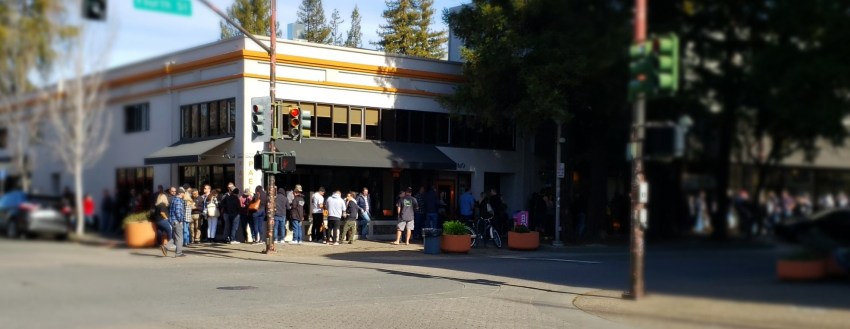 So smw, slt has landed for a bit of a vacation back home in Sonoma County, where conditions are different in many ways than what one experiences in Dhaka: here, I bike with pleasure and see quite different sites. And, well, unlike Dhaka, alcohol and its consumption are legal though regulated. Since I was having such fun with my daily “signs of the city” photos from Dhaka, I figured maybe I’d do the contrast with signs of the county, here in Sonoma County and Santa Rosa. Today’s offering: from my bike back from UUCSR on Sunday morning, the annual ritual of hundreds of beer lovers lining up to be the first to taste this year’s release of Russian River Brewing Company’s annual limited-output “Pliny the Younger.” It was only through my beer-buff brother than I learned quite how big a deal this is in brewing circles — apparently RRBC is quite the name amongst the brewing community nationwide, and this line gets *long* on the … guess it’s usually the Sunday of President’s Day weekend? The very first February after I set up a home here, I was doing the same ride from UUCSR back to my place early one Sunday and saw this massive long line, and being a former New Yorker I thought “are they buying concert tickets? Or is it a new JK Rowling book release??” Then I remembered it was early on a Sunday, and noticed the crowd skewed much older (all drinking age) and more male than the JK Rowling crowd…plus it was 2015 that year, and hey, she hadn’t had a major line-up type release for quite a few years…so then I biked to see where they were lined up and voila, I learned about Pliny the Younger 😊