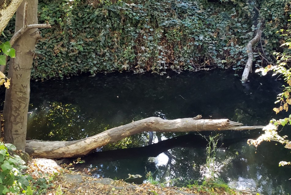 Imagine, please, what I failed to photograph: the beautiful rust-feathered hawk that flew from left to right along the creek’s path, just under the dense tree canopy, just as I got off my bike to contemplate the reflections in the water. Had I but drawn my camera faster and clicked video :-(. But, please: imagine.