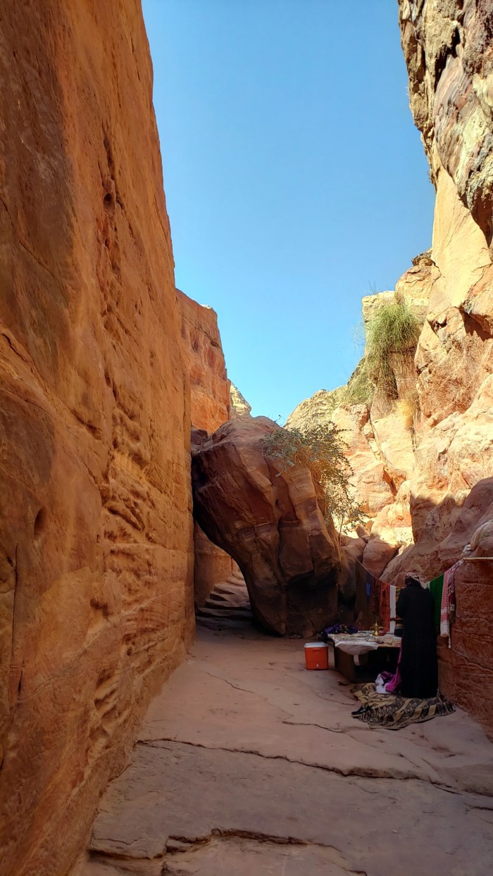 You should imagine Paul, belly full from a pretty decent lunch buffet with plenty of water and tea, now walking up a long path with a welcome amount of shade because I timed this for the afternoon when the cliffs on our left would provide some respite. The path leads to a building that is quite amazing, which is high enough up that it’s less than ten minutes further on to where you can look down over a precipitous drop from the edge of these mountains, over to the Negev Desert in Israel, and north to the Palestinian Territories. The vendors really wanted business. I may have bought more than I normally would, because it was just so clear that tourism was way lower than usual and everyone needs to earn a living. I don’t regret a single thing I bought :-). Below: the obligatory orientation shot to show you where the cliff face of the Royal Tombs sits as seen from this path. You’ll notice that we’re now higher up and farther away.