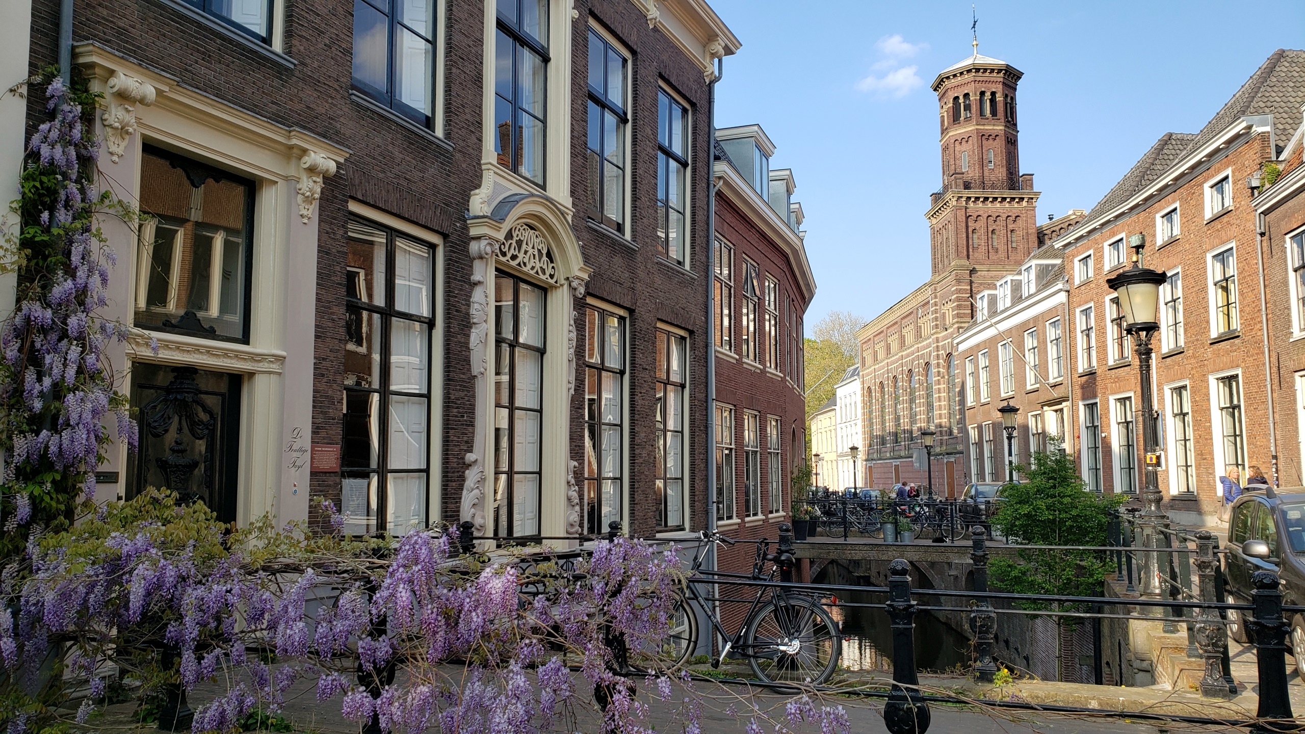 We’ve had a lovely spell of sunny days with nights cool enough to keep all the lovely spring flowers blooming longer. So on walks and bike rides I’ll see not only still-blooming daffodils & tulips, or cherry and apple trees, but also wisteria like this. Many homes in Amsterdam – and also, as you see here, in Utrecht – have gorgeous, big wisteria plants trellised and blooming in spectacular profusion. Sadly, when I see them in A’dam, it tends to be when I’m rushing past on my bike during the morning bike-to-work rush hour, with no ability to stop and snap a photo. Will try to change that in the weeks ahead, before I lose the chance this season…