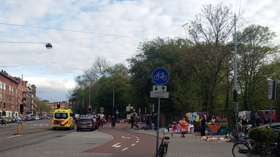 April 27th is King’s Day here in the Netherlands – they celebrate the reigning monarch’s birthday in uniquely Dutch style. What this means, so far as I can tell, is three things: a) It’s one of the rare “bank holidays” where just about every office and shop is completely closed (since one gets more weeks of actual annual leave / vacation here, one doesn’t need to depend on the three-day weekends to breathe, as one does in the US), and this year it fell smack in the middle of the work week which was kind of fun; b) As demonstrated in this post, here in Amsterdam it’s the one day per year where folks are allowed to lay out their wares on any old street corner for sale – and key parks like Vondelpark are reserved for kids; c) Once the day becomes more advanced, all the rest of the adults come out and turn more or less the entire city into one continuous, enormous citywide moving block party, with bands everywhere. Oh, and unlike the US, one’s allowed to drink in public here – though the city’s site reminds everyone that one bottle (allowed) means one bottle, not a six-pack (not allowed).