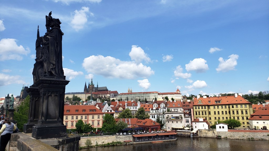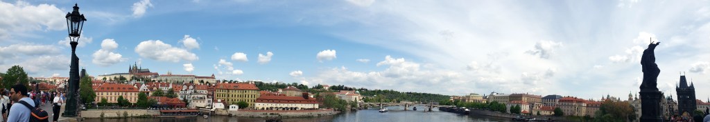 Above: Prague Castle (it’s all of those buildings atop the hill, with the cathedral the most distinguishable element to the whole complex) with one of the many sculptures on the Charles Bridge in the foreground. Below: a panorama showing the river, the castle, the bridge, and the city on both banks.