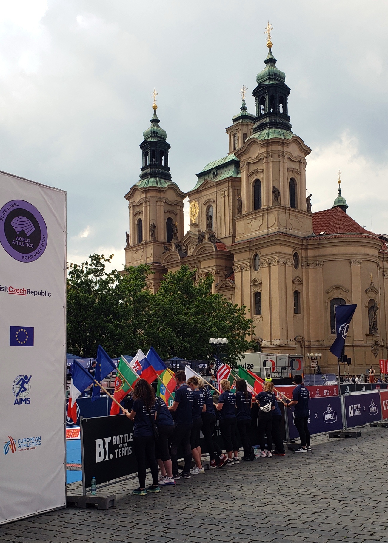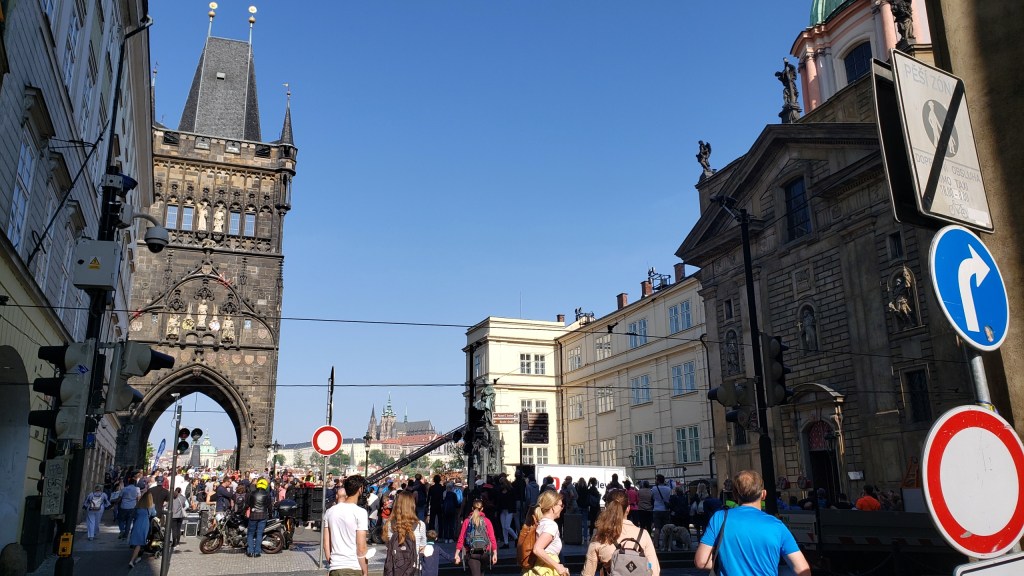 It was Marathon weekend in Prague – yes, they’re coming back across the Charles Bridge in the above and bottom-right photos, shortly after the 9am race start; and bottom left is later, when the stragglers finished. (The announcer pointed out that Prague is generous because most marathons hold the course open for only six hours, whereas Prague holds it open for seven hours.) In between those two outings, I was up at the national monument (well off the race route, naturally), which we’ll show you in other posts to come :-).