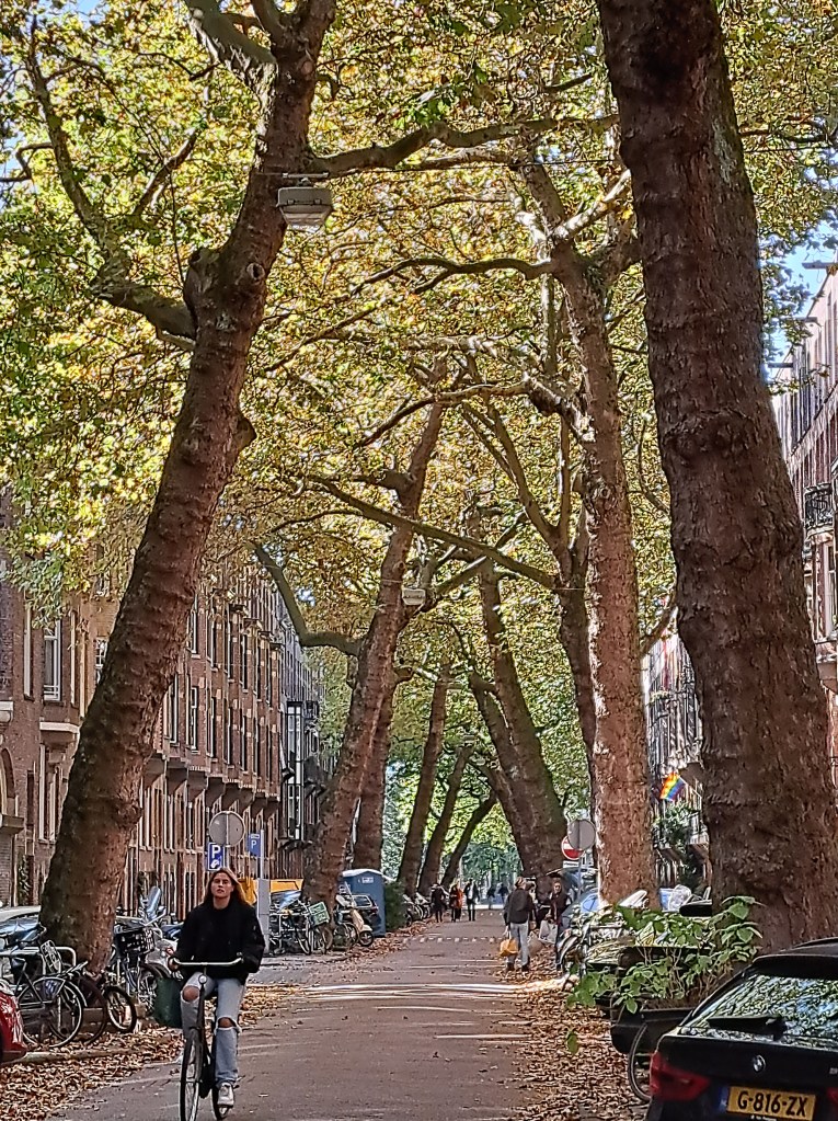 I actually live down on the corner at the end of this block, and have confirmed my suspicion that at least one tour guide book to Amsterdam lists this street as a lovely little “hidden corner” because of the tunnel effect created by the trees and how the sunlight filters through the leaves, and sometimes – depending on weather and time of year – shines directly along the street. It’s really quite remarkably lovely at the right moment, though no photo can do justice to those moments. Took the photo on my way back from one of those pop-to-the-supermarket moments since the light was shining nicely and decided have to post it now, before the very last of those leaves you see has fallen…