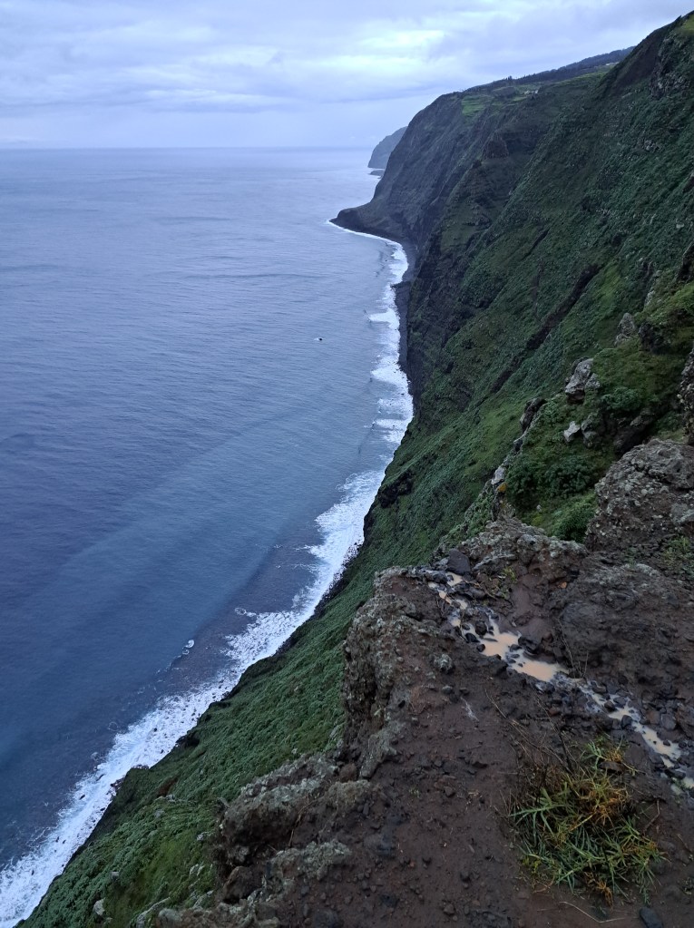 Roughly five hours after I took that photo I last showed you, of Seixal on the north coast, we found ourselves in a scary-windy, wet end-of-day moment at the lighthouse on the farthest west point of the island, the Farol da Ponta do Pargo. These are the cliffs looking northeast from the ledge below the lighthouse. Standing there was both beautiful and frightening. From this point, going west, the next inhabited land would be one of the islands of the Caribbean – and that’s a long, long way away.