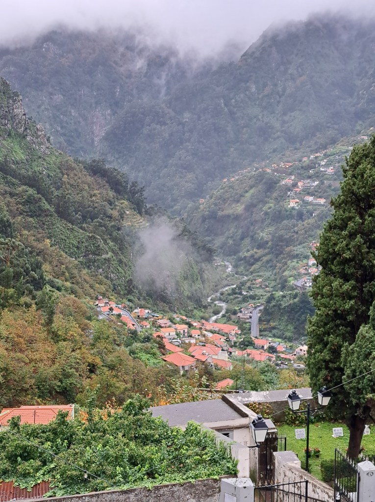 Views from the center of the village of Curral das Freiras, looking both up (above) and down (below) — so that you have a sense of how remarkably steep is the valley across which this little village is spread. The name means Pen (or Corral, or Refuge perhaps…) of the Nuns, apparently because nuns took refuge here during some attack of the Napoleonic wars, though accounts vary. I didn’t take any photos from the top of Pico do Arieiro, which we visited next, simply because there was so much fog, wind and rain that there was absolutely no point.
