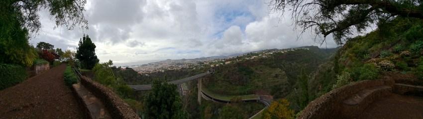 Above, the port of Funchal with several cruise ships visiting, as seen from the Jardim Botânico da Madeira, i.e. Botanic Garden of Madeira. Below, one of Madeira’s most-photographed sites and certainly the most-heavily visited part of the gardens. (The words on the far side, which you’ll see again below, are too fuzzy to read but I believe I recall that they say Jardim Botânico da Funchal. Below that, various photos demonstrating not only the lovely gardens themselves but also the remarkable views and impressive civil engineering of roads, tunnels, home and towns on Madeira.