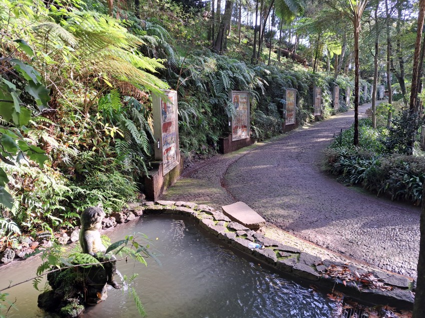 Its museum building houses two floors chock full of unique African Stone sculptures from Zimbabwe and elsewhere, of a style and beauty that I hadn’t yet seen at other museums or countries I’ve visited – as well as a floor of geodes and other minerals for which I just didn’t have time. Its walks host a lovely series of commissioned (must be) tile art showing the historic kings & queens or Portugal plus its republics, as well as an overview of Madeira’s history, and then a dazzling range of contemporary and historic decorative tiles from around Portugal. These and more you will see in photo galleries below. Thus, the beautiful and unforgettable Monte Palace Gardens gets its own special entry and inspired me to revive my Urban Garden series even more than the other lovely gardens of Funchal had already prompted. (For those paying attention, you’ll notice here as well as in yesterday’s Botanic Garden post that those traditional A-frame houses from Santana also merit a place in each; and I still have more to show you from Santana itself, when I get caught up.) I hope you enjoy these photos even a small fraction of how much I enjoyed my five hours there.