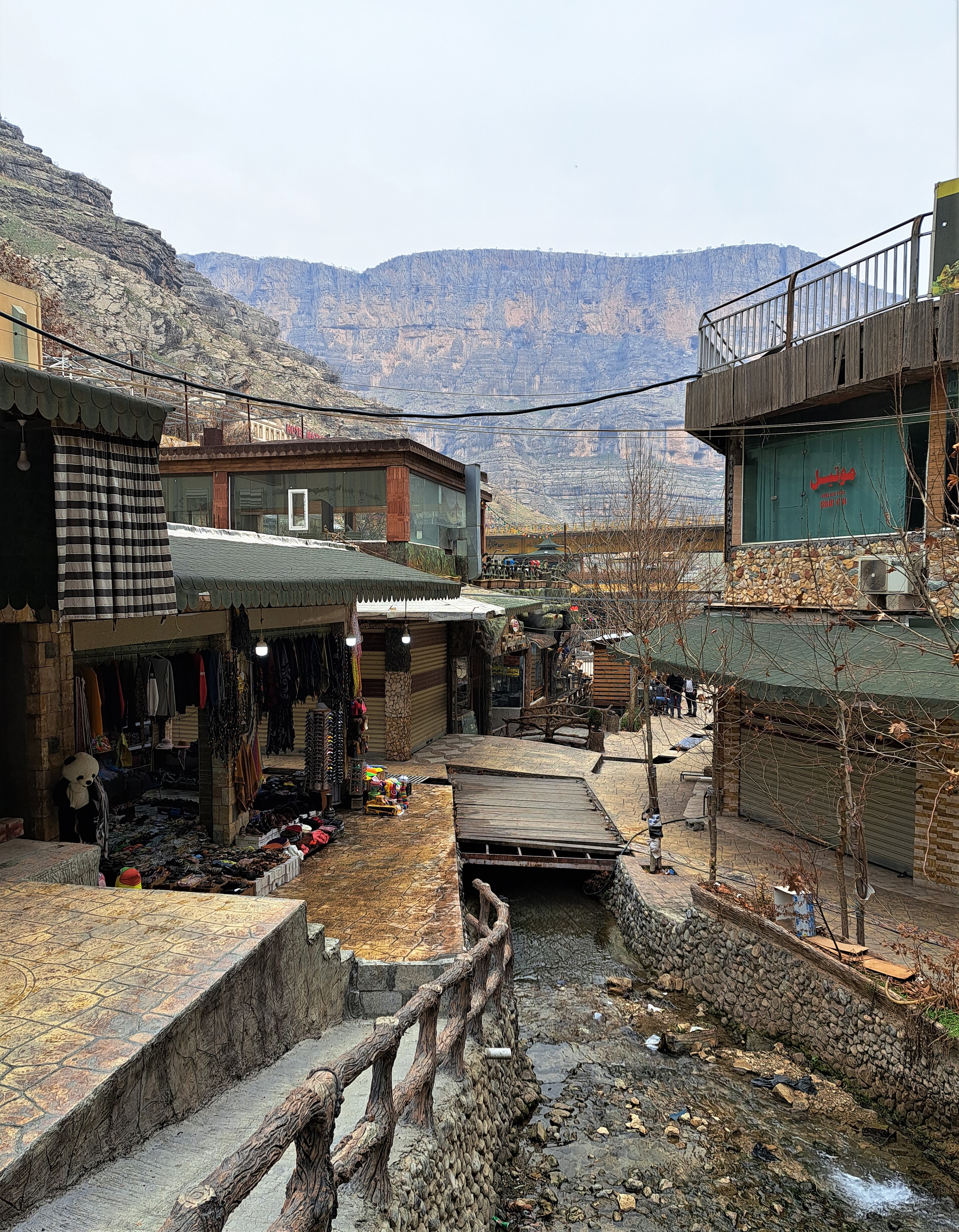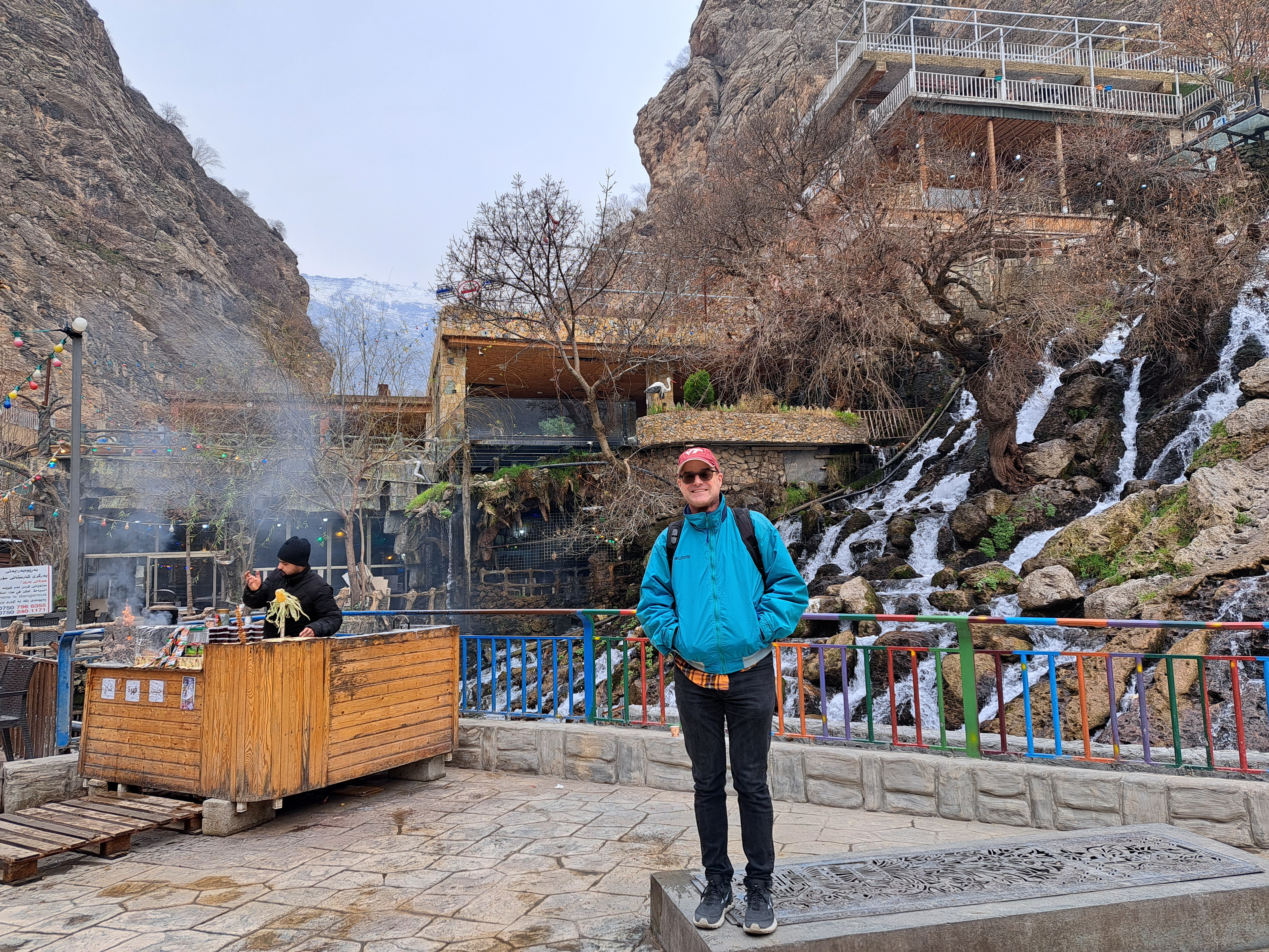 During that break from blogging, I got back to Iraq again for a work visit, including a lovely Saturday exploring the beautiful touristy mountains and waterfalls north of Erbil. Finally getting around to sorting and posting some of those, now. This was not, obviously, peak season — folks flock to these cool, waterfall-blessed high-elevation villages and mountains for relief all summer when the sun cooks the plains. We, on the other hand, got to see snow (higher up on the mountains in the distance, below) and a glimpse of winter :-).