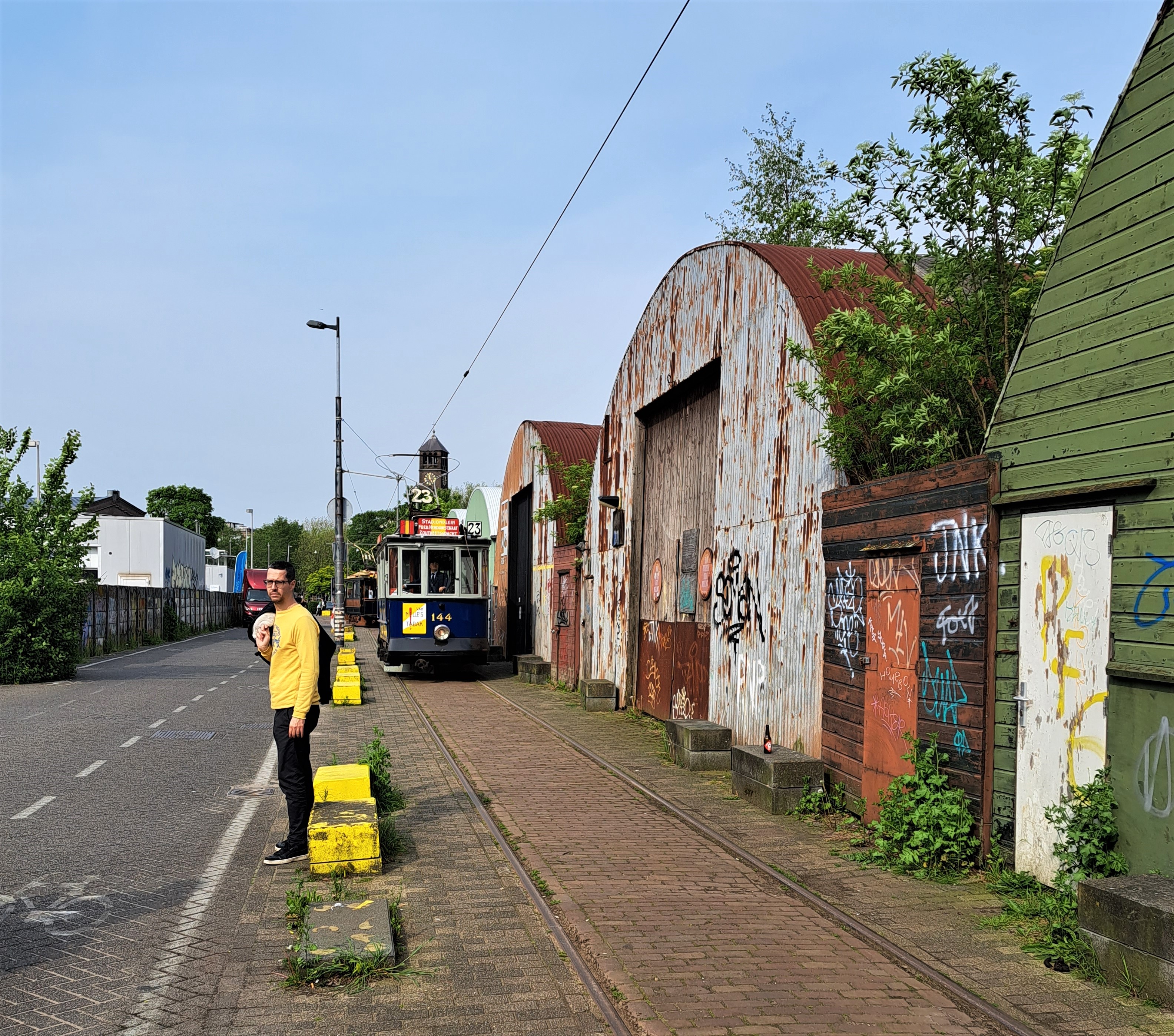 Having shown you some graffiti art of more or less this very thing in a recent post, imagine my delight when, on Sunday, for the very first time I saw vintage trains (related to the tram museum which is also somehow affiliated with this whole affair) rolling down these very tracks and right past that very mural, clanging their bells loudly since most pedestrians walk along the tracks these days. 🙂