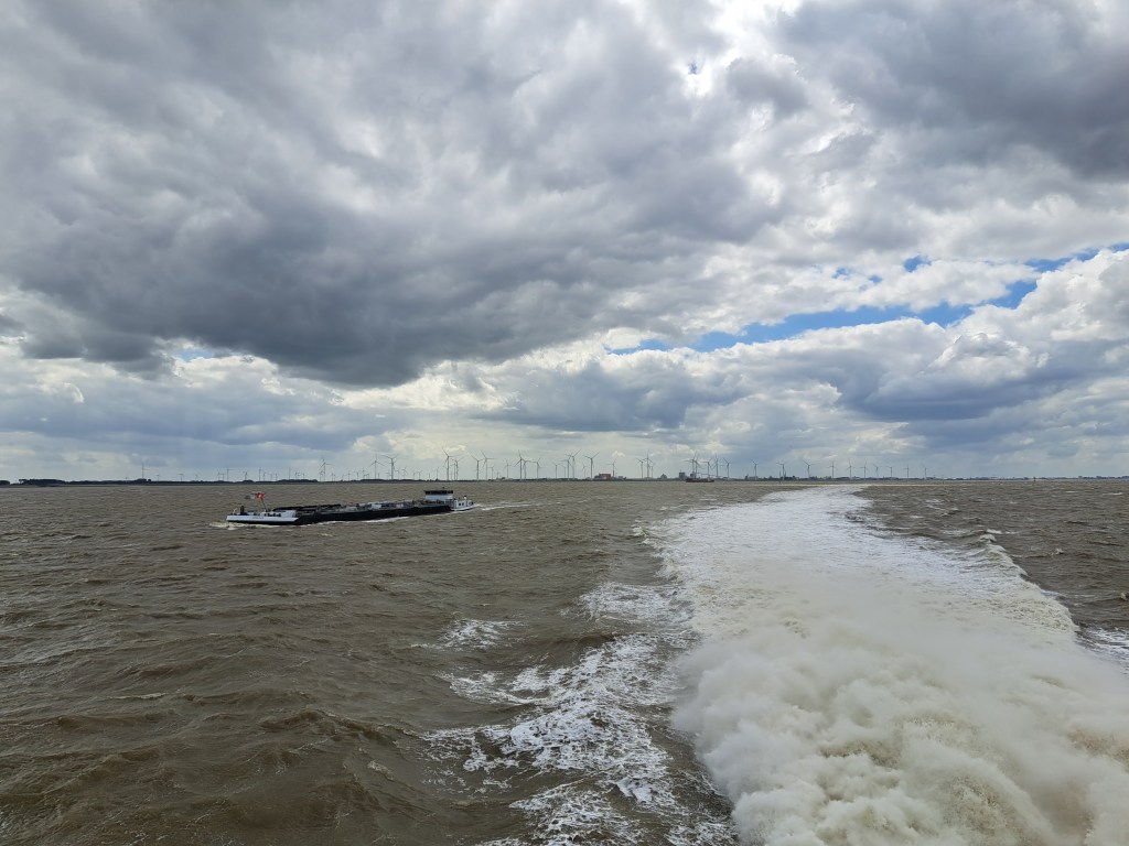 Last photo taken on the boat back from Borkum to Emden above, and first photo taken on the boat from Emden to Borkum below – both lookin at the wind farm on the NL side of the river. So many things one can do with coastlines, eh?