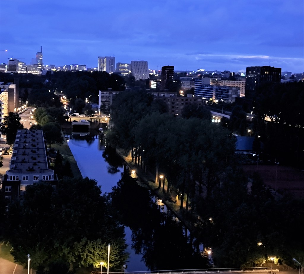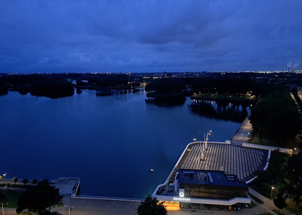 Two early-morning views from my new place (just moved, middle of the week past) – above, looking north from my bedroom and below looking west from my living room. We’ve shown you Sloterplas, the lake below, in this previous post as well as a few others. You’ll be seeing more of this, and much less of my last neighborhood park going forward 🙂