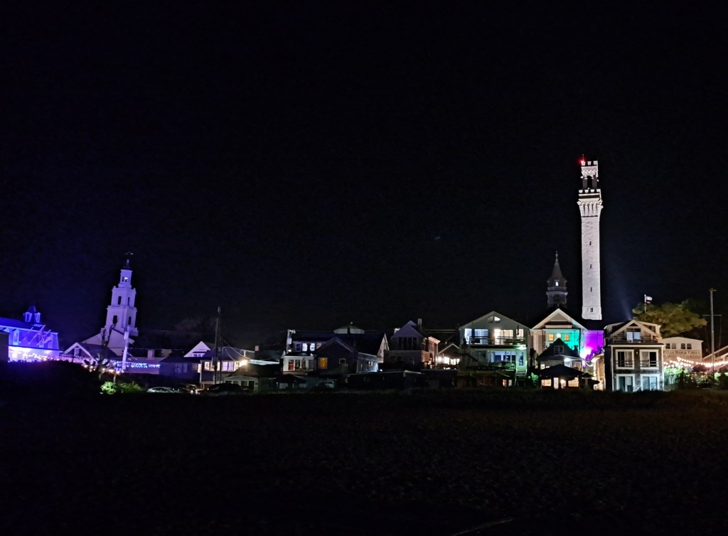 I’ve spent the past week visiting Provincetown, at the tip end of Cape Cod, for the first time in more’n a decade. In the early 1900’s, Provincetown decided it was tired of Plymouth getting all Pilgrim credit, since apparently the Mayflower landed here first before traveling on and finally deciding upon Plymouth as their first village in this new colony. What you see above is nighttime P’town with the Pilgrim Monument – built to remind everyone of that fact – standing proud and tall on the right. 🙂