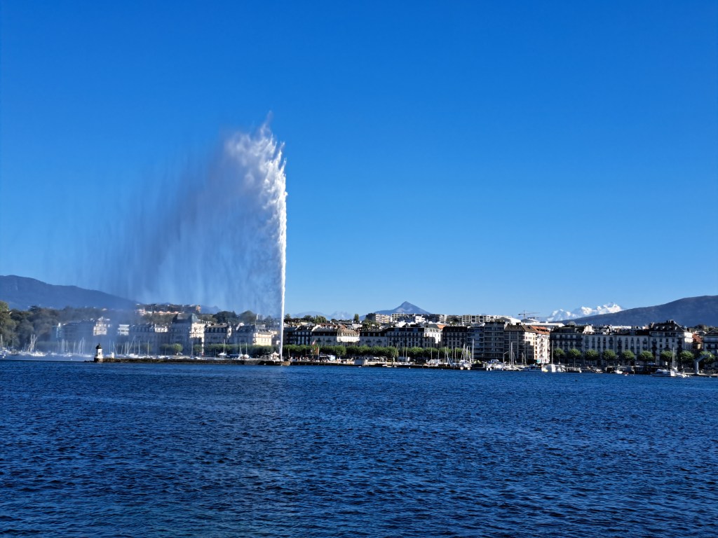 Our last post was my first view of the alps, looking west-southwest as our plane started to line up along the French-Swiss border for its final dawn approach to land in Geneva. Thanks to an ungodly-early departure from my home on Thursday (after a late return from a delightful bassoon recital with Sam the prior evening), we arrived in viewing proximity to this magnificence at just the right time to enjoy that pre-sunrise glow without having to deal with the glare of el sol shining directly into the phone’s lens. These were taken the following day after a meeting downtown, when I got to see Mt. Blanc rising behind the city – last month when I was there the clouds were too to experience this, though friends told me it happened often. Wow.