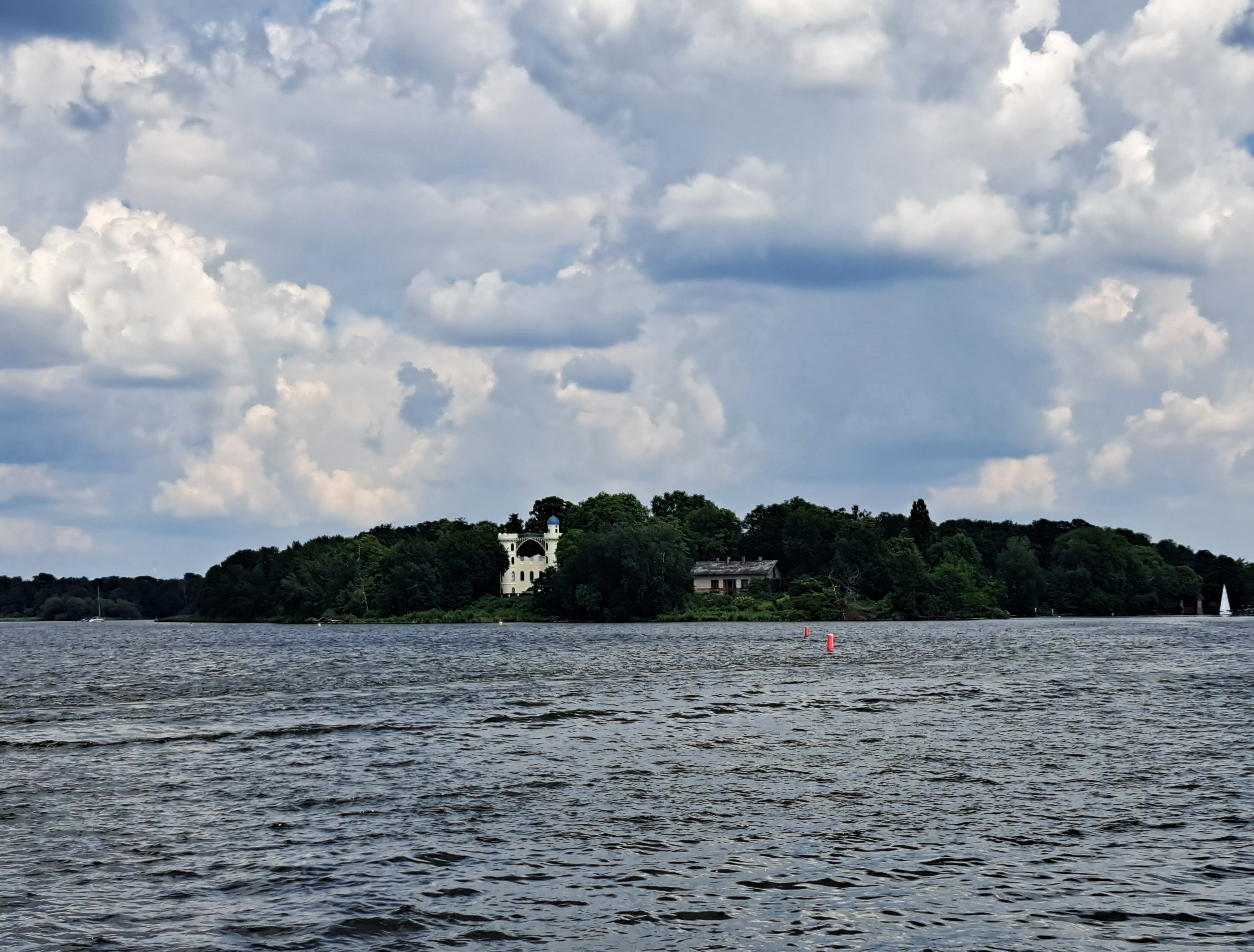 Peacock Island (Pfaueninsel) in the Wannsee – Havel lake and canal network in the SW corner of Berlin along the border with Brandenburg. When West Berlin was surrounded by a walled and guarded GDR, this was a lovely natural escape from the city vibe, which I myself first visited with my mother in May 1980. Steve – now a renowned and published scholar in German studies – and I spent a delightful late-May weekend in Berlin recently, during which in addition to fabulous educational narration from him, we did a lovely cruise during which we also stopped off and re-explored this island, a former royal back-to-nature pleasure garden from the 18th Century, complete with peacocks to add to the vibe, and royal dairy built to look like a monastery.
