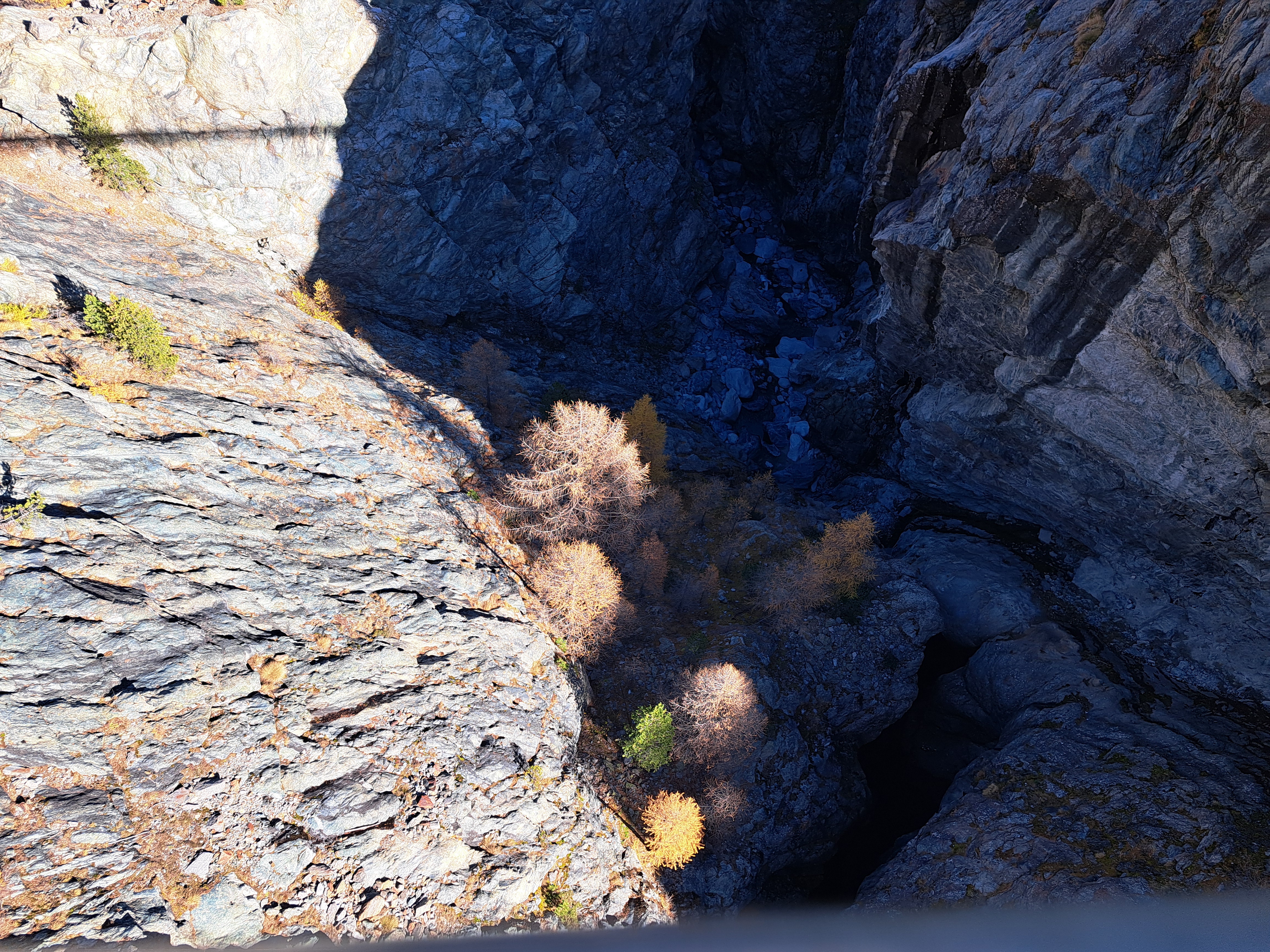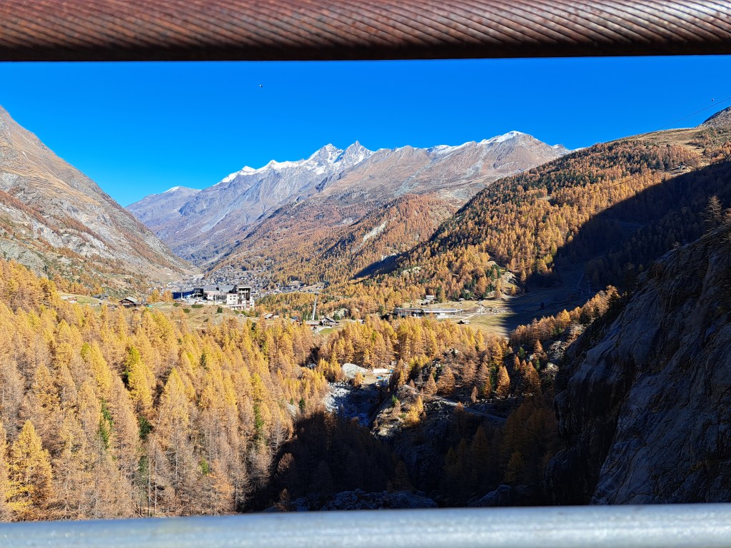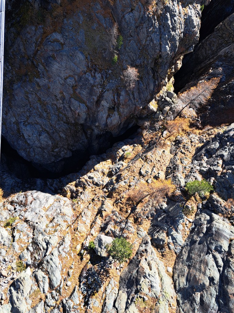 As I mentioned yesterday, I was heading to Switzerland from Paris. This is me today in Switzerland … in mid-air on a suspension bridge. Looking directly down from said bridge, you’d see what I show you next. Thereafter, a few more scenic shots all from mid-air on that bridge :-). The village in the valley is Zermatt, my home for a few more nights this week. Some of you may be able to deduce what this means you’re likely to see next…