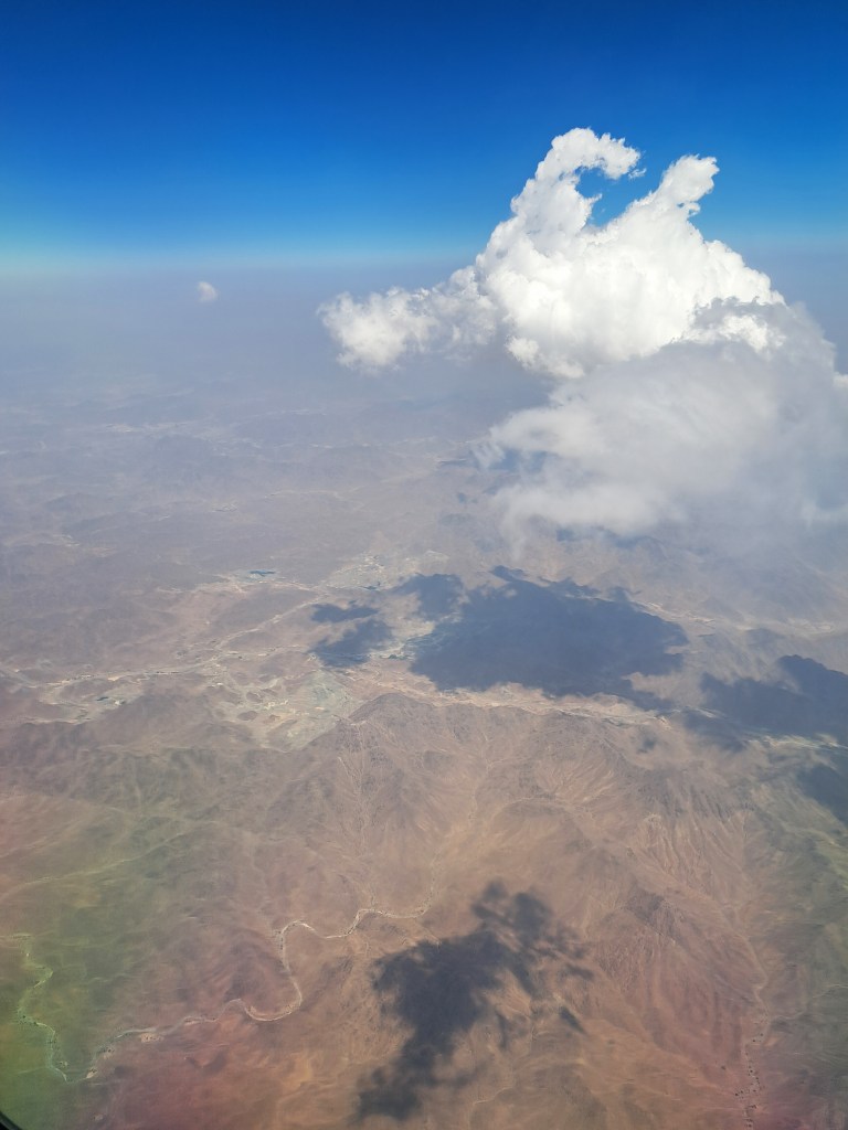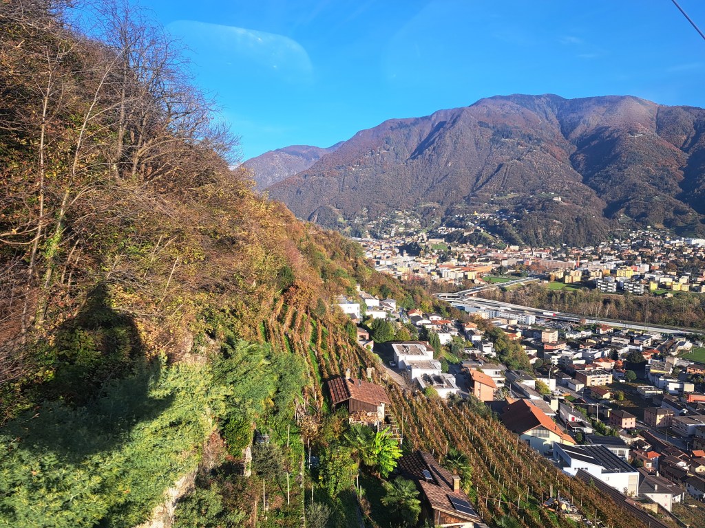 Above, your last shot of those Hajar Mountains over UAE on the Dhaka to Dubai run in September. Below, another of my new form of “in the air”-ness, taken from a gondola high above the valley of the Ticino river on my way to a mid-mountain stop that gave me access to a Tibetan hanging bridge that connected two villages without having to go up or down and around, not too long ago. You can see the shadow of my gondola on the mountainside, plus some of the city of Bellinzona in the center – left. Much more on both the Tibetan Bridge, and Bellinzona and its pivotal role in history, later… 🙂