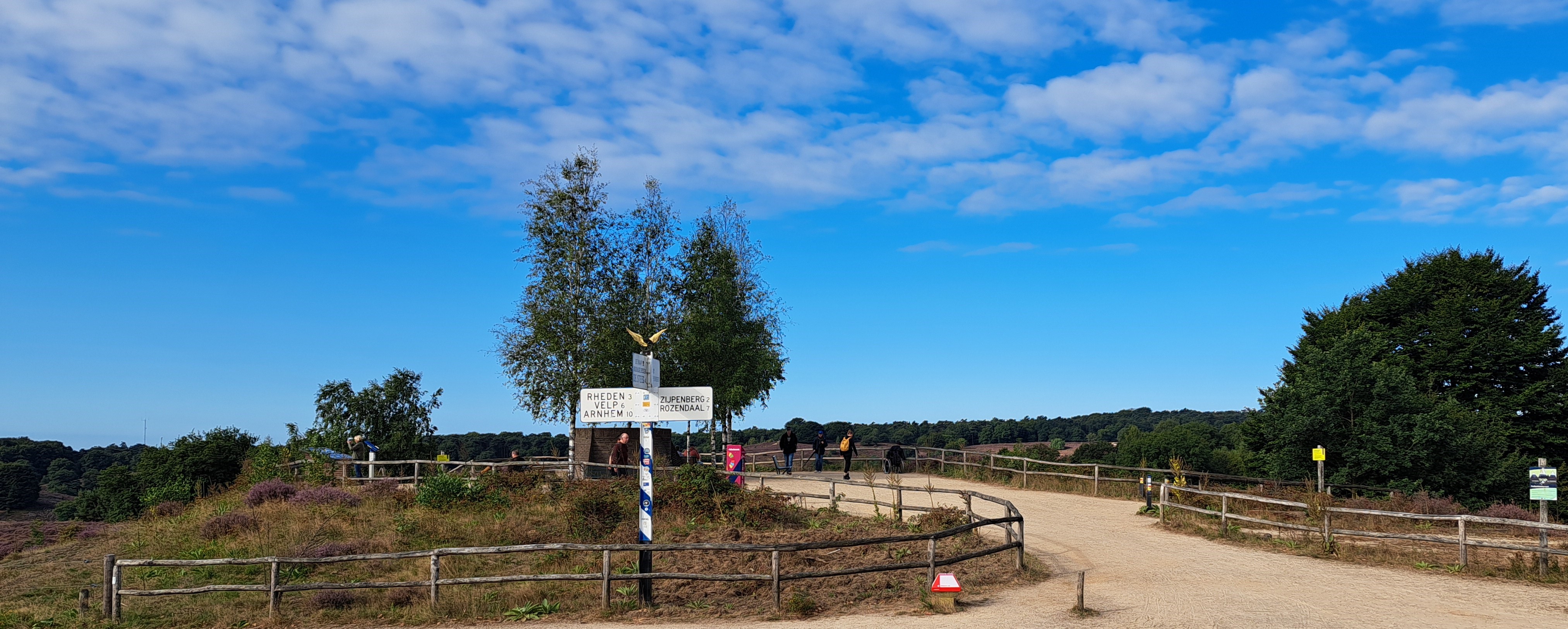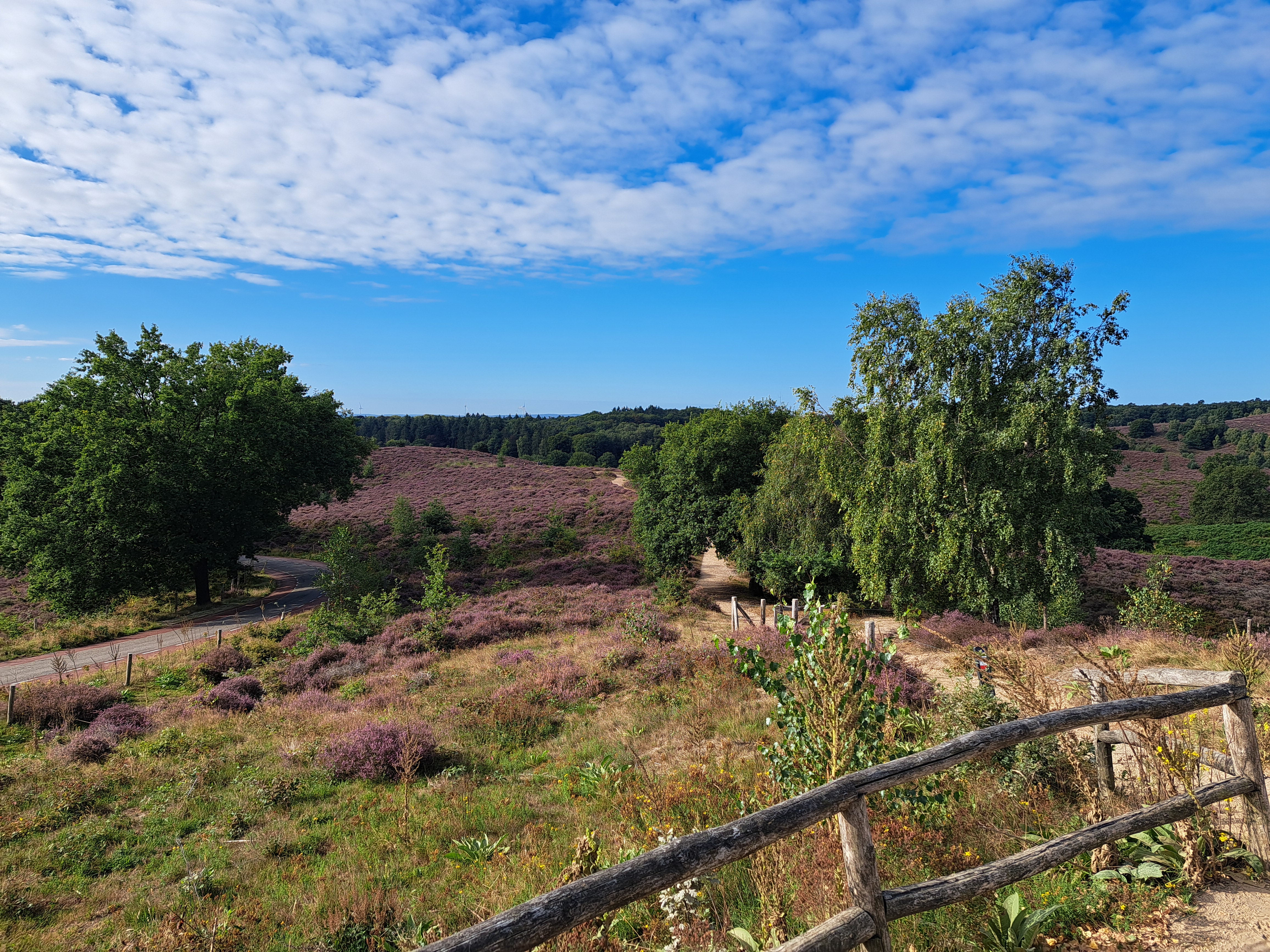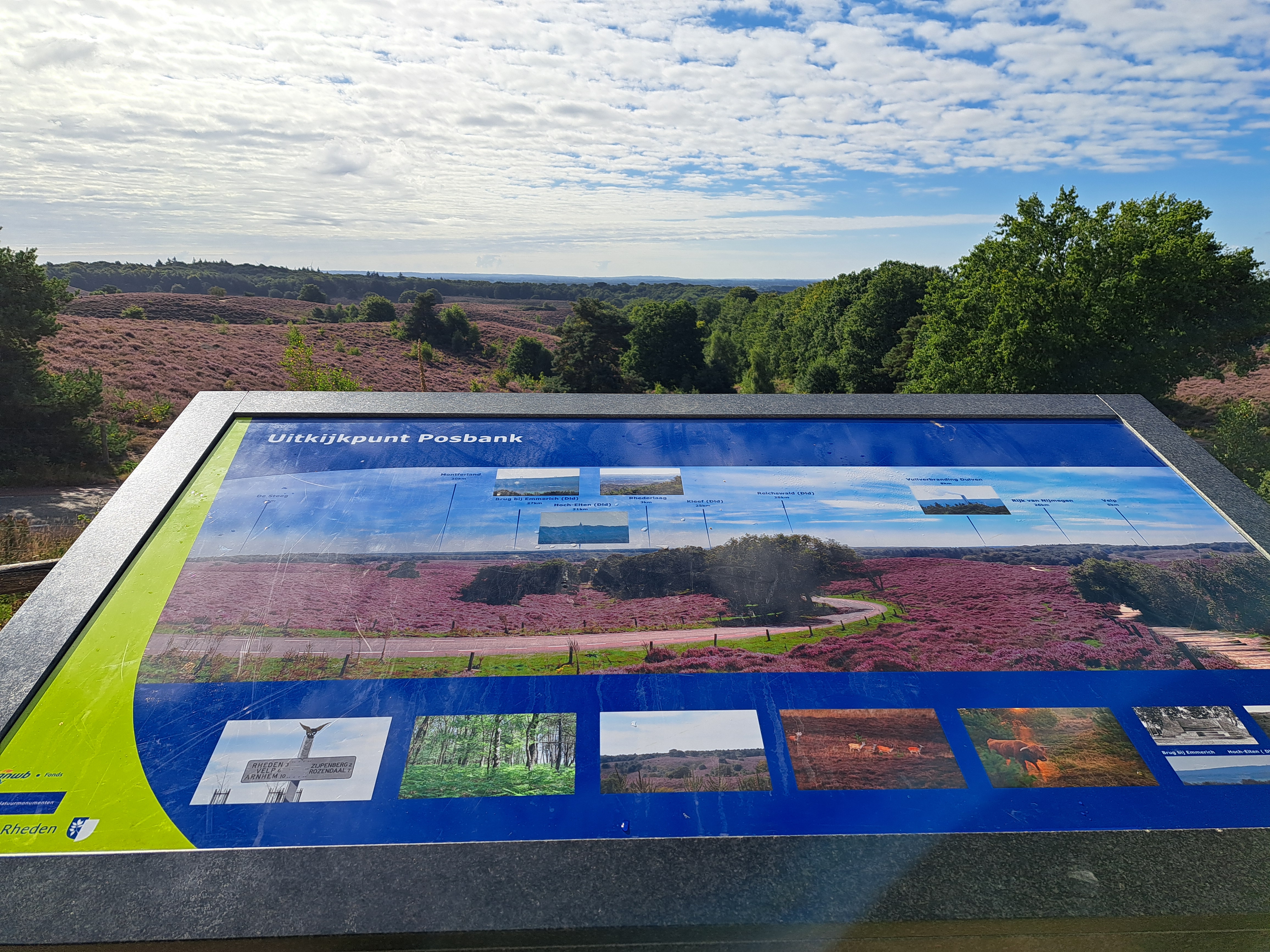 I took this photo less than 24 hours ago at the lookout point called The Posbank, at the dizzying height of 90 meters above sea level in the Veluwe Zoom, oldest of NL’s national parks. I’d biked through the park from north to south Friday, en route to Velp where I spent Friday and Saturday nights. Quite amazing, really, that the fairly large city of Arnhem (capital of Gelderland in which I spent all my vacation) is only 10 kilometers away from this gorgeous spot which felt really rather remote, though yesterday morning quite full of walkers, bikers, and those who’d driven their cars up to enjoy the views and the well-positioned restaurant behind this photo.