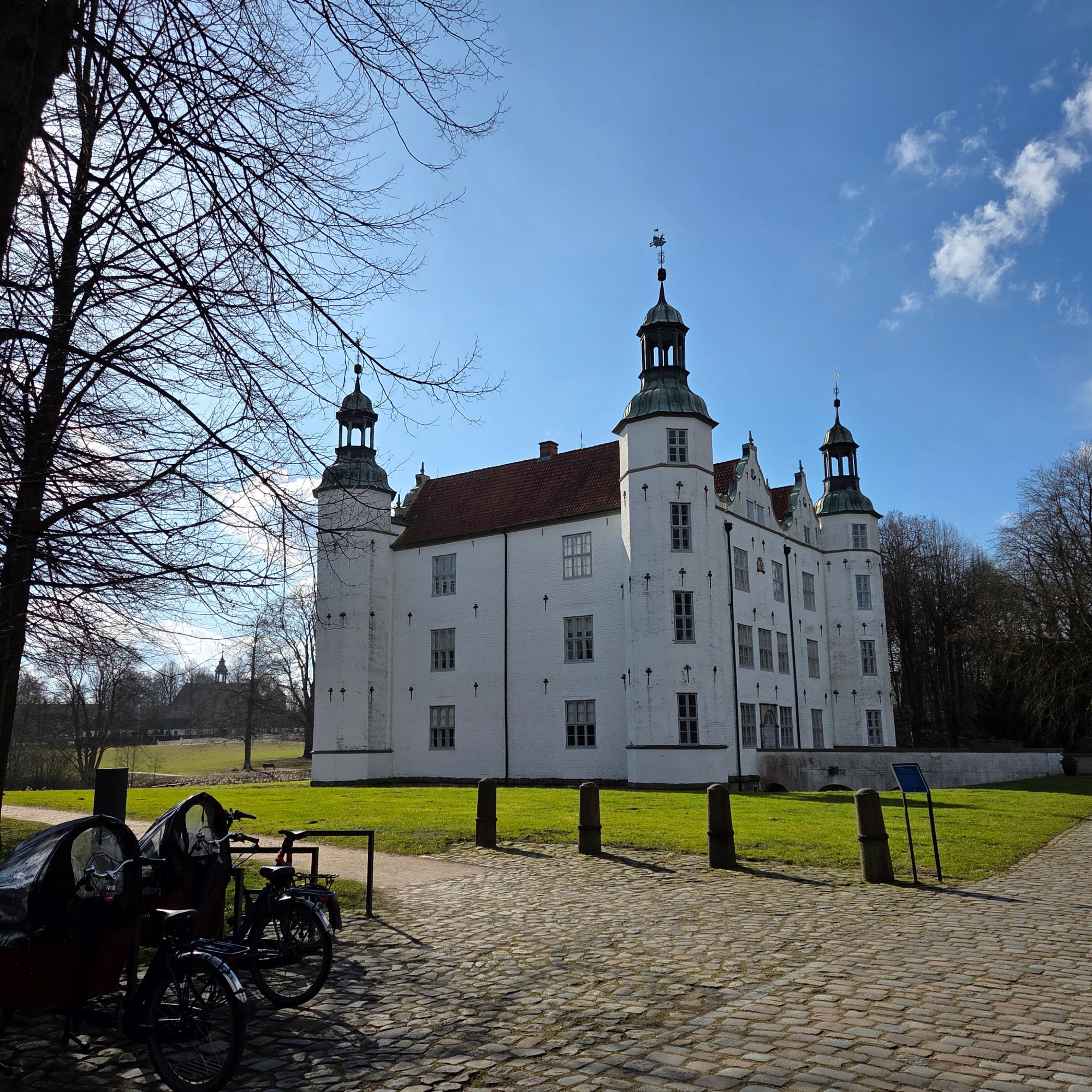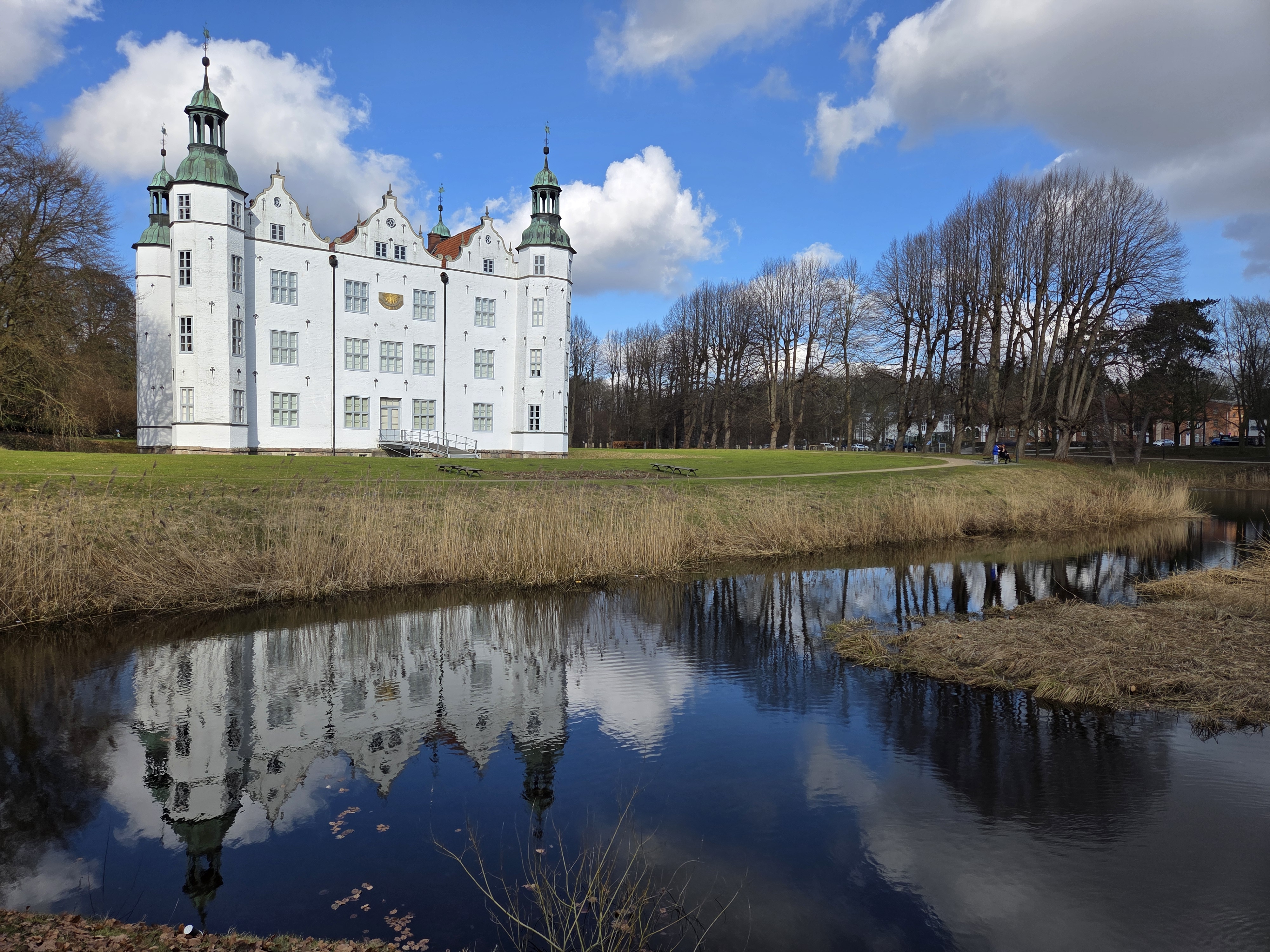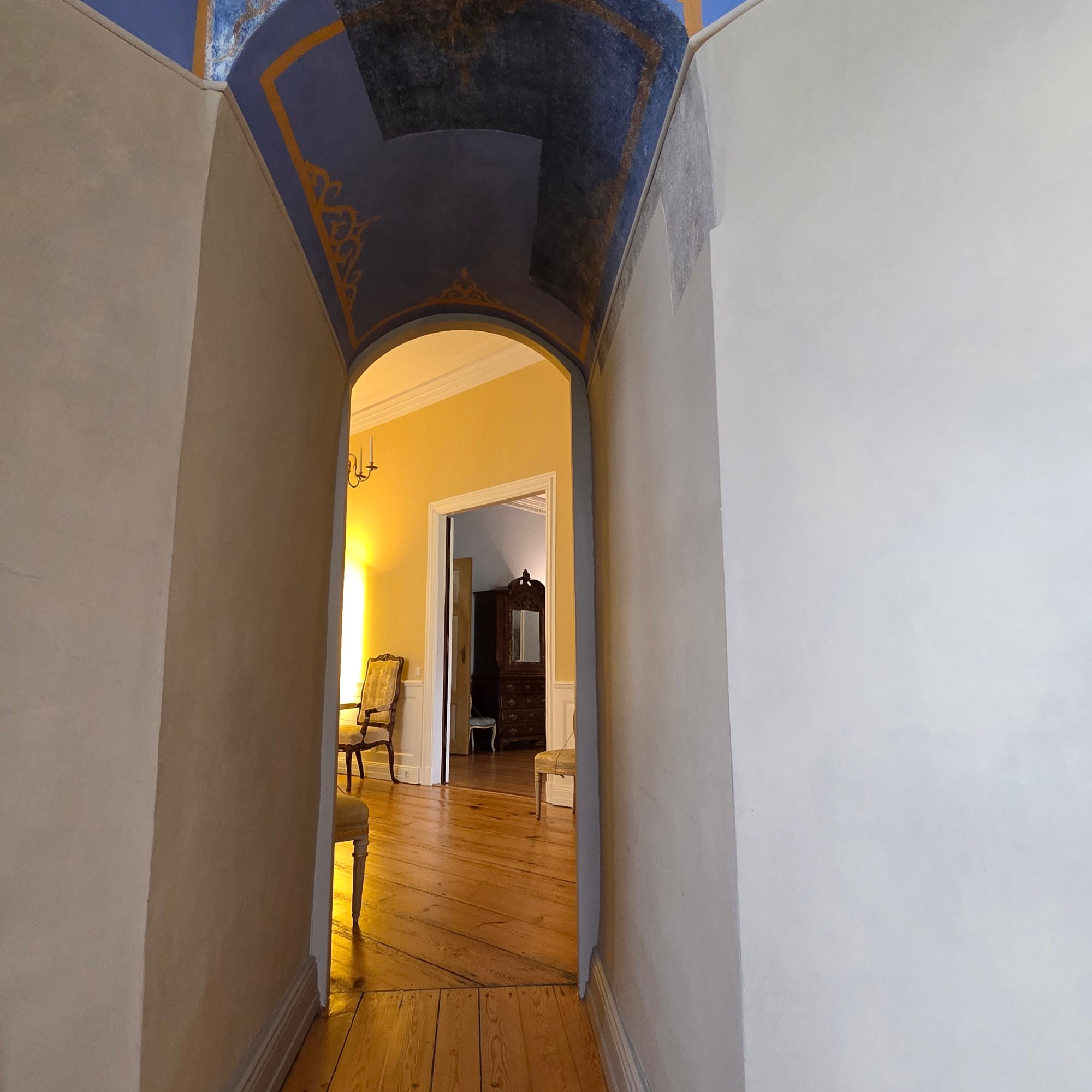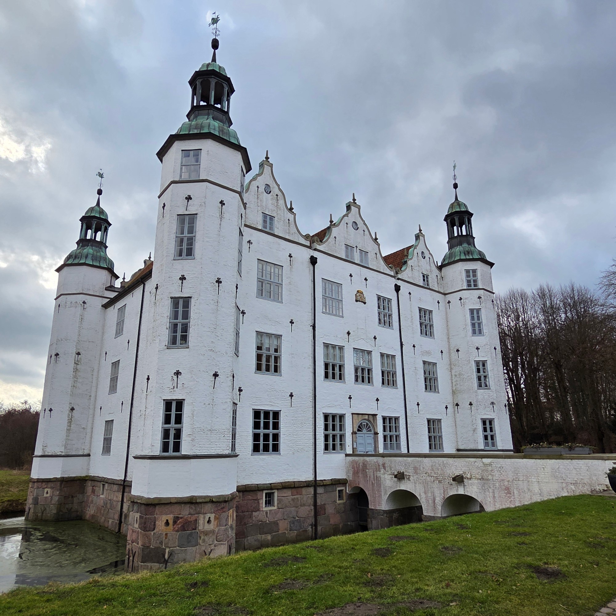 The castle at Ahrensburg, outside Hamburg, was completed in 1585 during the hundreds of years in which most of what’s now the German State of Schleswig-Holstein was Danish. At least one Danish king visited this place in the 1700s at some point. It was the very first rather-legitimate nobility-related castle I saw with my own eyes, back when I spent a year living nearby before college. Oddly enough, I never went inside, never even entered the gardens and grounds to explore, ’til last weekend when I was back for a longer visit than I’ve managed in recent years. If you’re in large-screen or full-view mode, you’ll see three round photos in a row below; the one in the middle was taken from the ground-floor turret room front left in the photo above, looking inwards, and if you enlarge, you’ll see areas where recent renovations uncovered some centuries-old paining, which they’ve tried to match a bit to show what the old colors would have been when fresh.