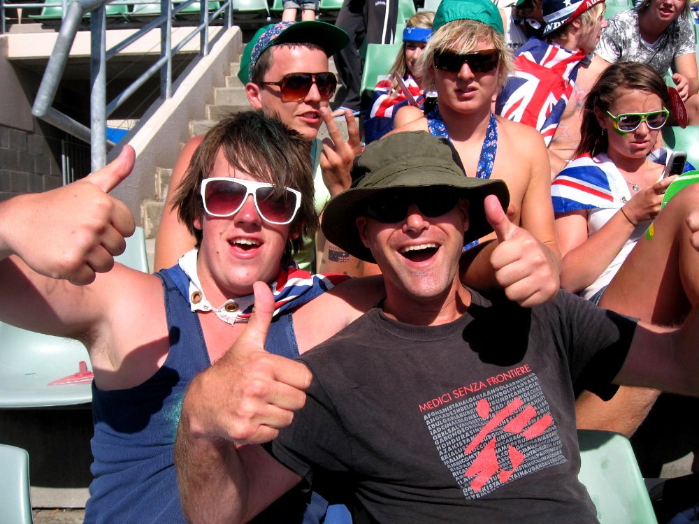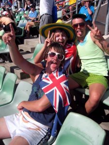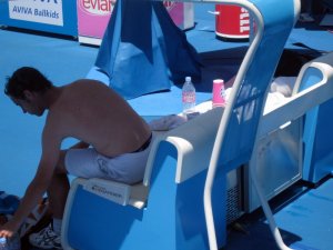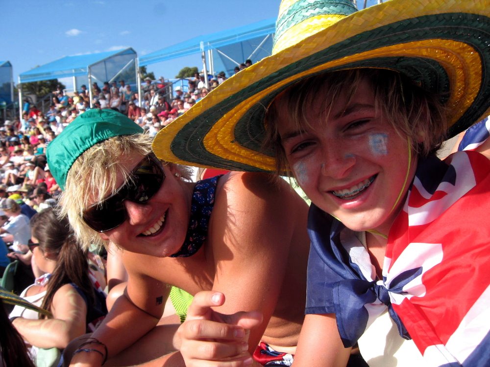 …Aussie fans are so much fun, especially in the first week when there are still Aussies in the draws for whom they can get drunk, paint themselves in the national colors (officially the flag, but yellow and green for sport), and shout out “Aussie Aussie Aussie, Oi Oi Oi” endlessly during changeovers.