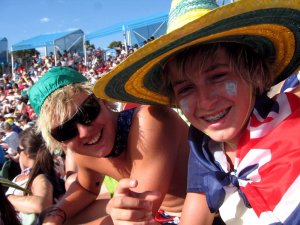 Federation Square is the recently-created center of Melbourne, home to the Ian Potter Center which houses the Australian portion of the National Gallery of Victoria — Aboriginal and European-tradition art by artists from or tied to this continent. There’s an enormous public space there where crowds hang out to watch live concerts, cultural events, and so on. During the Austrlian Open, matches were displayed live on a big screen during the afternoon hours to anyone who wanted to enjoy the crowd and the square despite the hot sun, and then in the evenings a live concert came on. The square was packed on Austrtalia Day with folks there both for the Australia Day fireworks over the Yarra River and the concerts on the public stage, and for the tennis matches broadcast before hand. Herewith some shots of the town, the stands, and some of the proud Aussies who took it all in. (The adorable and friendly guy below moved here recently from Margaret River – see above — to play rugby with the melbourne Storm rugby team. As I see it, he alone is more than sufficient reason to start watching the Melbourne Storm!)
