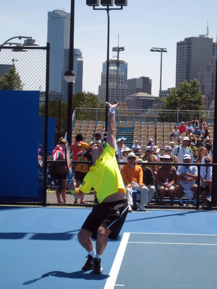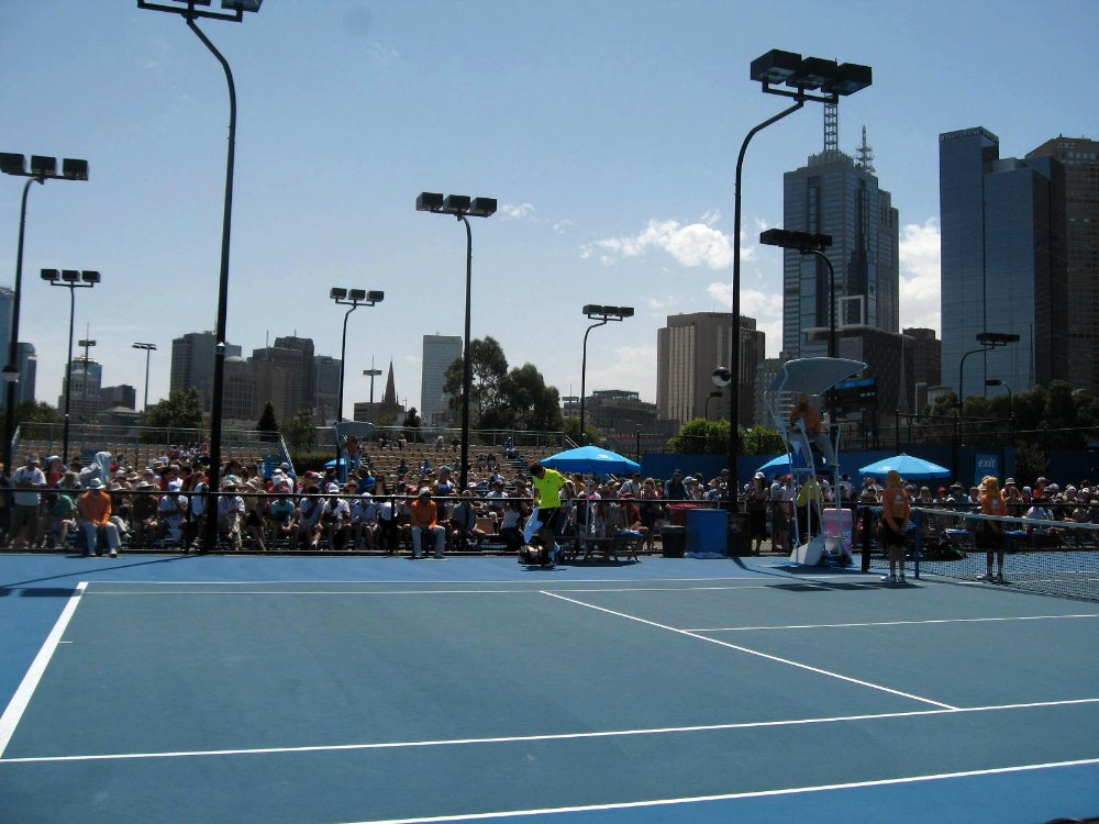 …this being one of those smaller, outer courts, on which I watched Ernests Gulbis in the first round. One of many lovely things about the AO is that Melbourne Park is literally in the heart of the city, so sitting in the stands you’re seeing the skyscrapers of downtown right there, plus of course it’s easier to get to.