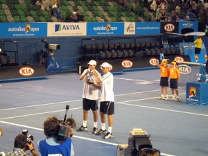 An advantage to being in the stadium is you get to see all the matches, including doubles which TV usually short-changes, because the audience usually short-changes it. We moved down to excellent courtside seats for most of the men’s doubles final which followed Serena’s demolition of Dinara, which the Bryans Brothers from Southern California won in three sets. I was close enough to get Bob’s left shoe, when he threw it into the crowd! Now if only I could figure out what to do with it…