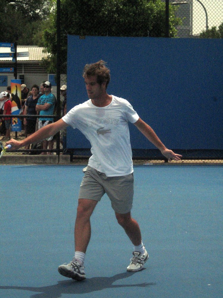 …since I love his backhand and his game in general, and never mind looking at him, I caught all Richard Gasquet’s early matches and cheered loudly in French for all the good points. Even enjoyed seeing him hatless – which never happens in a match – at a practice session.
