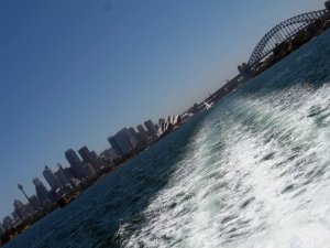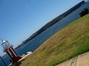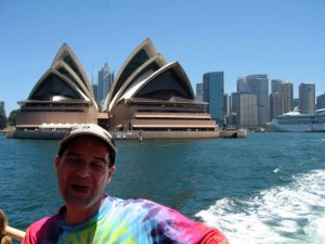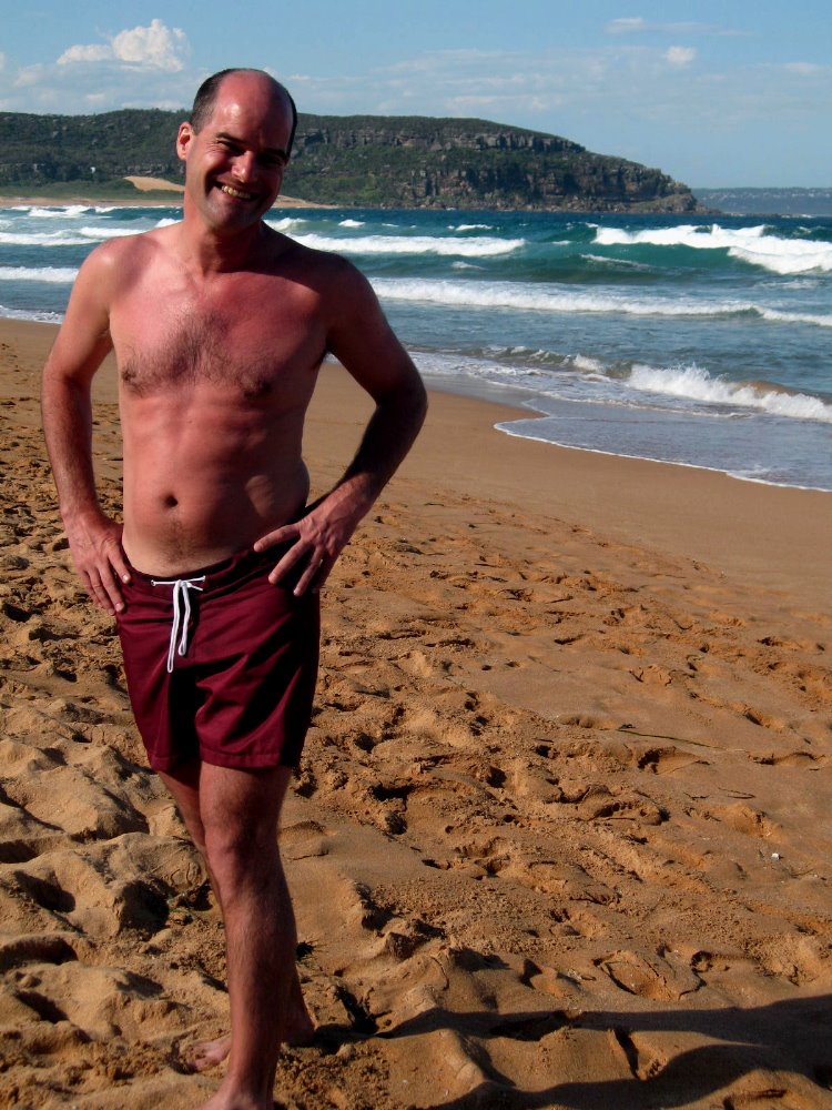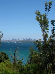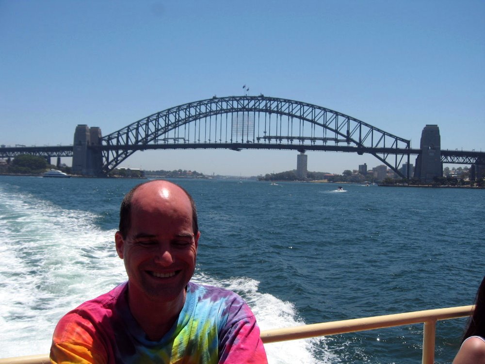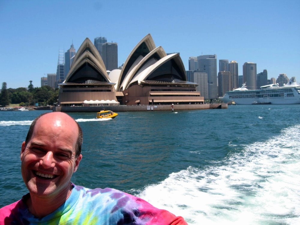 …Trudi went a little shutter-happy on our boat trip to Taronga Zoo from Circular Quay in downtown Sydney, and I’ve saved some of the better or sillier shots of me with the famous Opera House and Harbor Bridge in the background. Also above and below are shots of the skyline as seen from Lady’s Bay east of downtown, views of the South Head lighthouse (at the south entrance to Sydney Harbor aka, I believe, Port Jackson), and of North Head seen from South Head; and views of the Pittwater and me flexing what might pass for something vaguely six-pack-ish, at Palm Beach on the ocean side of the peninsula that creates that Pittwater. (Oh, look it up on google maps if you need to — north of Sydney.) Love you, mean it.