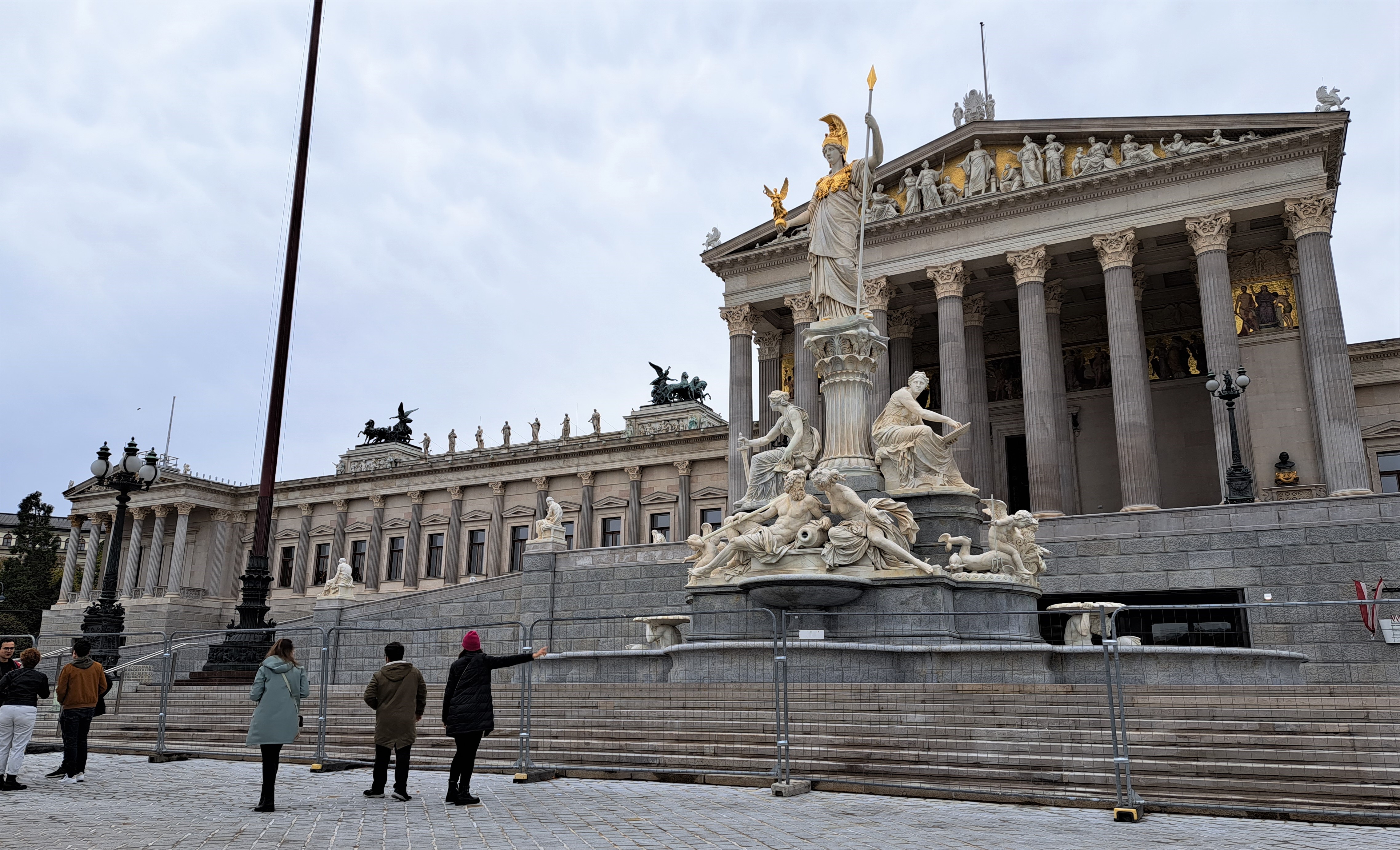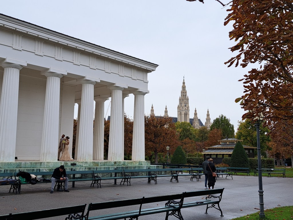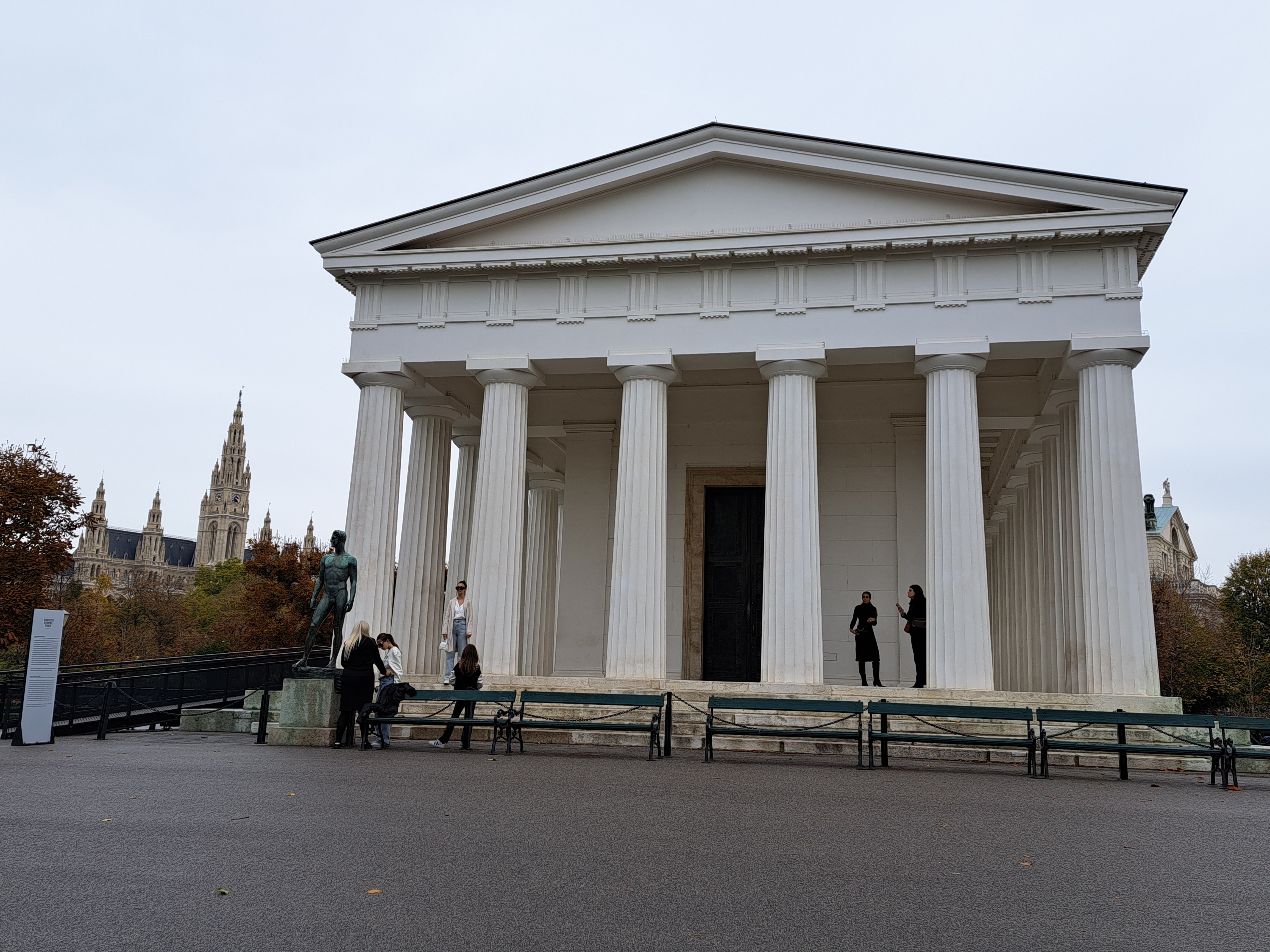 Herewith the remaining imitation-Greco-Roman art & architecture I observed (and took time to photograph – honestly, there was a great deal more than just this, but even I can’t take a new photograph every second step) during my long weekend in Vienna. Above: no, it’s actually not the Parthenon in Athens but instead the Austrian Parliament Building. Despite my initial guess that this was built in the aftermath of WWI, it was actually built in the late 1800’s, so while Vienna was still a capital of the Habsburg Empire but when they’d decided to create houses of lords and representatives. The Pallas Athena statue certainly seems to convey a message about the strength of a democracy…a message many of us hope remains true. 🙂 Below, an 1820’s “replica of the Temple of Theseus in Athens,” now a popular spot for wedding photos. (The original, wiki tells us, was really a temple to Hephaestus but featured statues of Theseus, so folks got confused over the millennia.) The fancy building behind the wannabe Theseus Temple is Vienna’s City Hall.