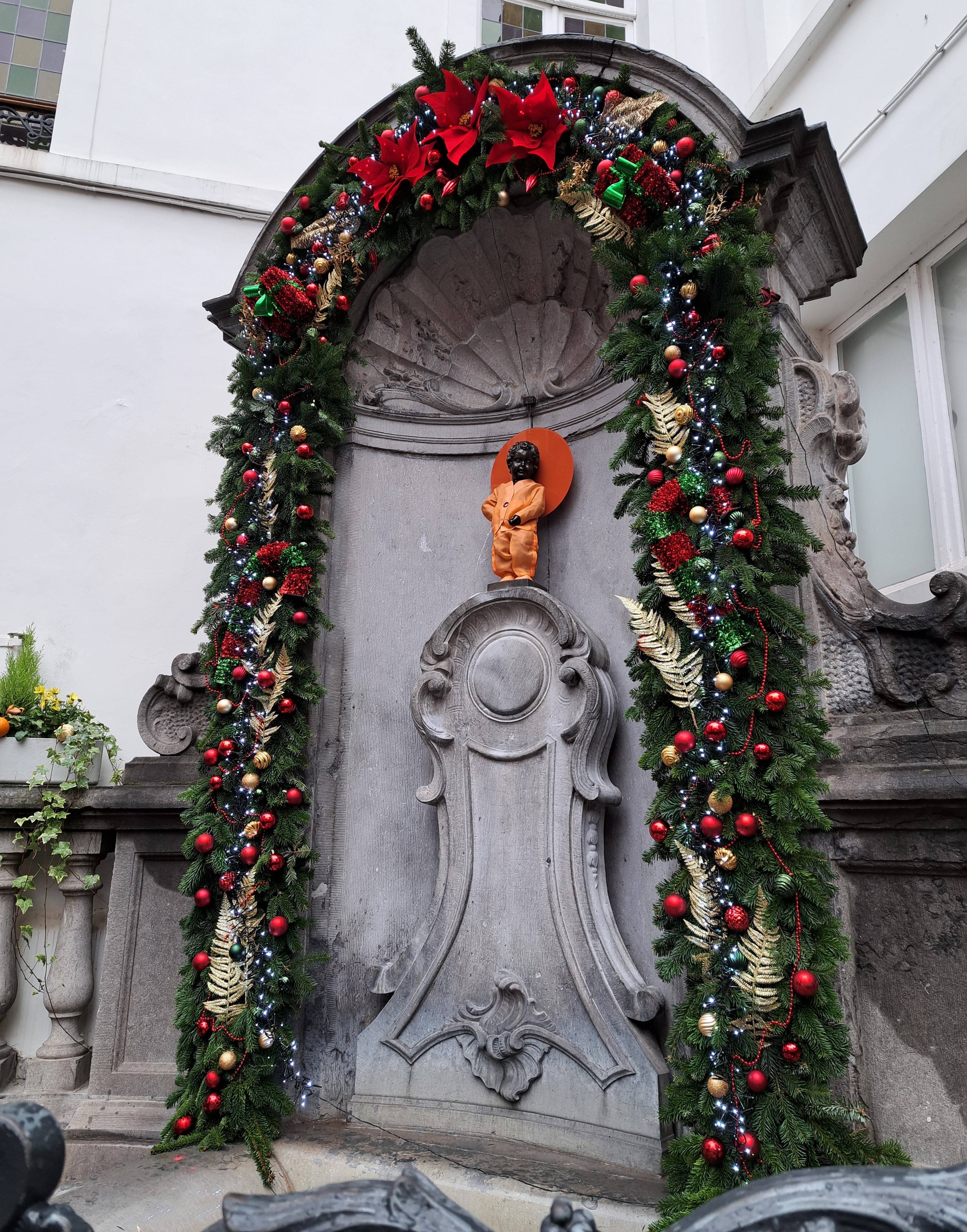 Moreover, though they do a good job of neighborhood lights here, there’s no culture of holiday decorations in anywhere near the over-the-top manner you’ll see if you click that December 2020 link. (The image below shows you what they do on the central plaza that hosts both Dam Square & A’dam’s Royal Palace – see, just not such a thing, eh?) But on a day-trip to Brussels shortly before I flew off for that exhausting trip to Southeast Asia, I did have the distinct honor introducing my dear friends Howard & Gene to the national symbol of Belgium, already decked out in his seasonal finery on that last (rainy, naturally) Saturday in November. They’d never known of the existence of this unusual national symbol of that neighbor nation-state to the south! 🙂