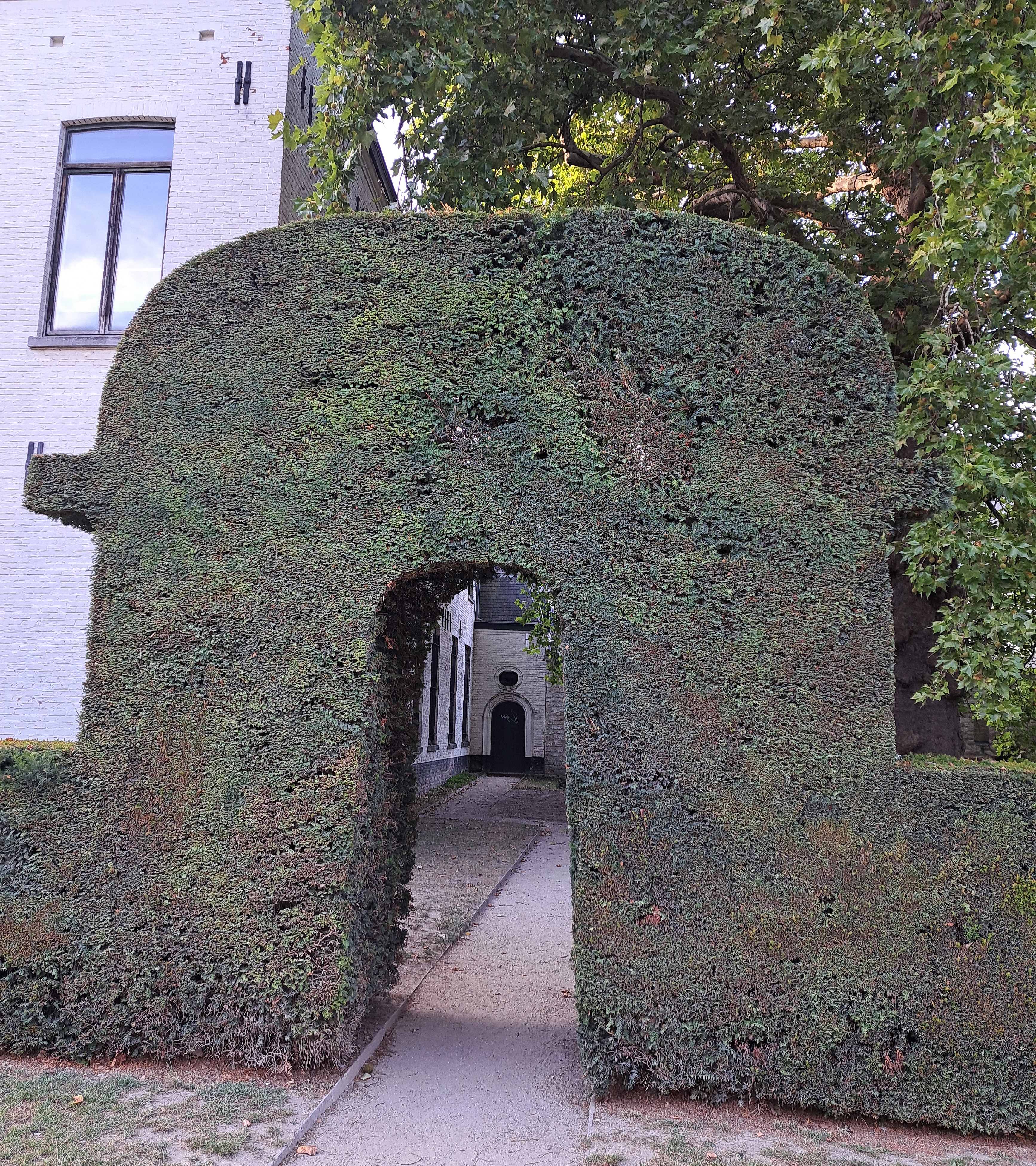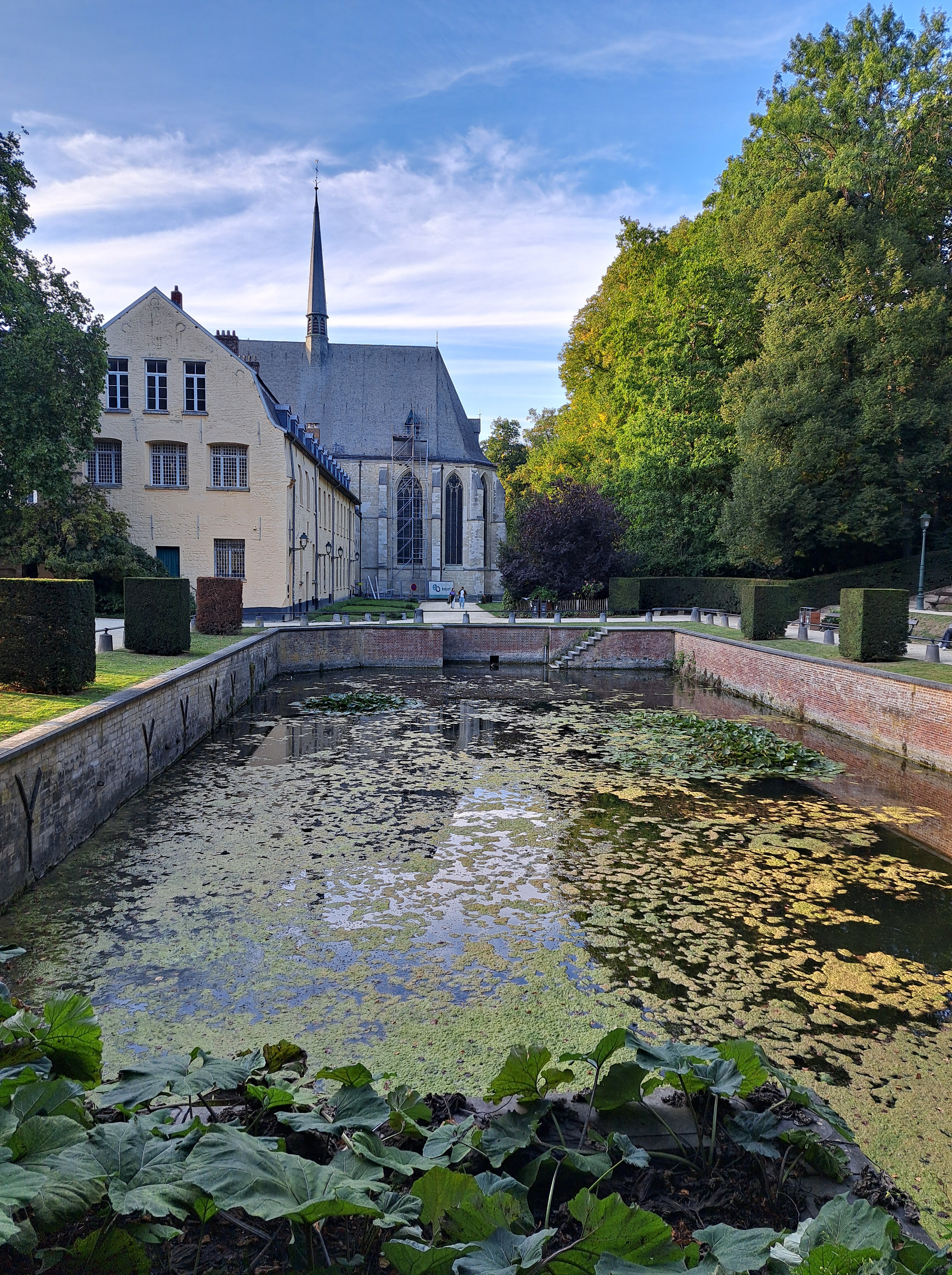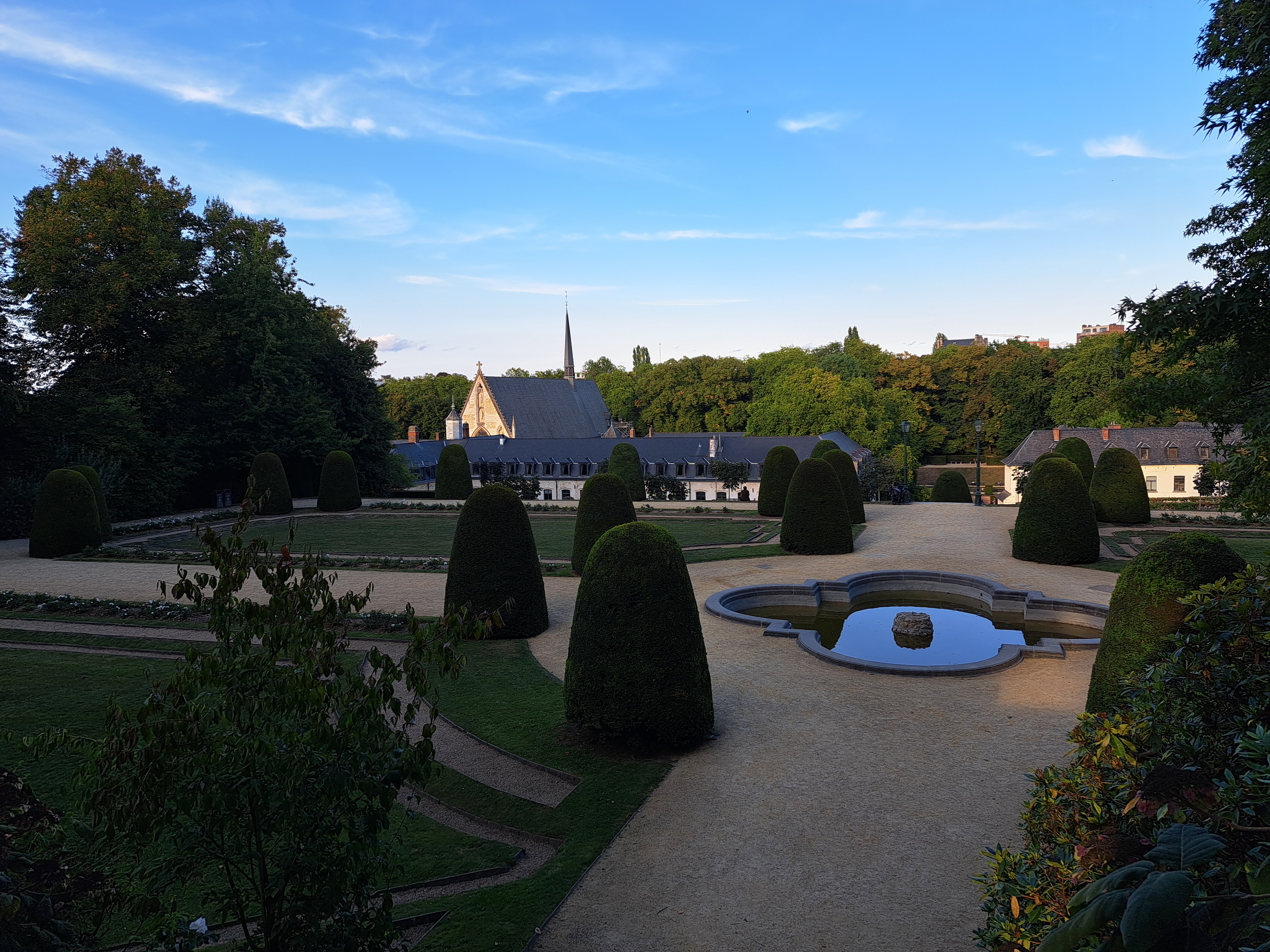 Another delightful discovery on an evening walk at the end of day-long meetings in Brussels last week was the gardens of the Abbaye de la Cambre, which from the late 12th Century until abolishment in 1796 (French revolution and all) was a Cistercian Abbey in the Maelbeek valley…which to most untutored visitors today looks like a hilly part of Brussels. Yes, unlike A’dam, Brussels has hills! 🙂 But then, it also has more uncleared dog poop on its sidewalks than A’dam does, just sayin’. Today the complex houses both some religious stuff and an arts institute, while the gardens are quite lovely and open to the public.