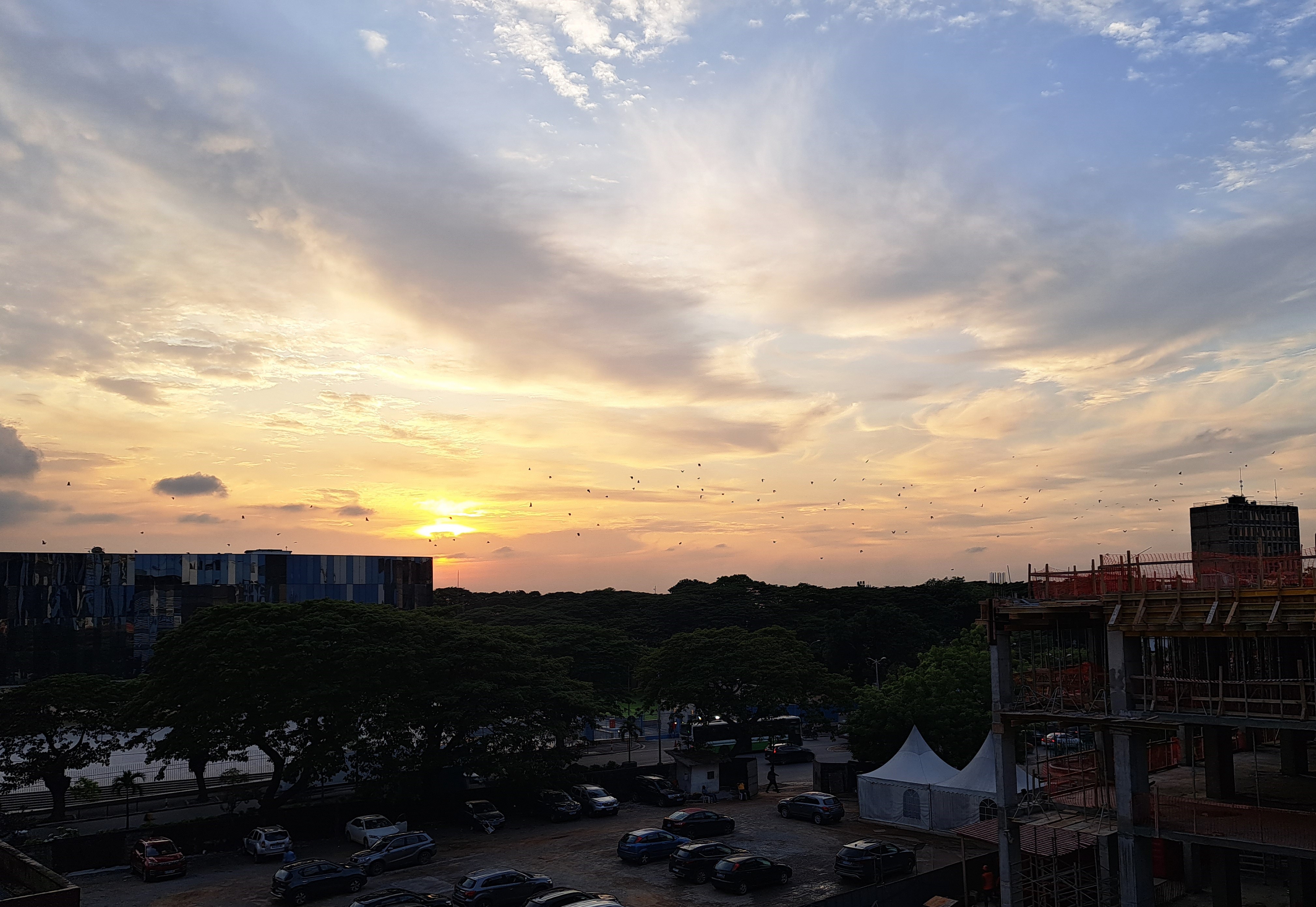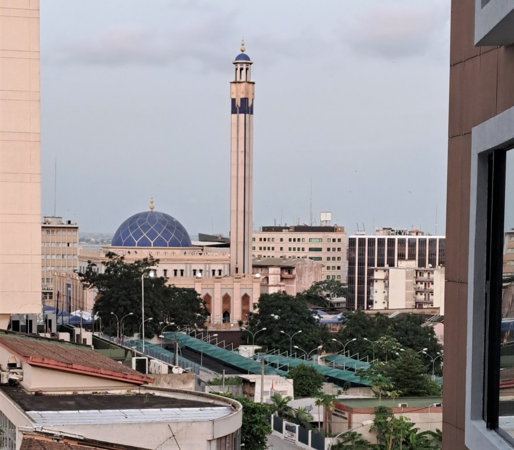 Winding down the photos I took on my short visit in Abidjan, end of April. Thought I’d already posted this — if you view it on a larger screen, or enlarge the image, you’ll see the daily dusk flight of the fruit bats going off to do their nightly foraging. I believe I recall once reading that fruit bats are among the most important pollinators for the world’s most popular fruit, the mango — several of which I greatly enjoyed while there, so, hey – thanks, fruit bats!