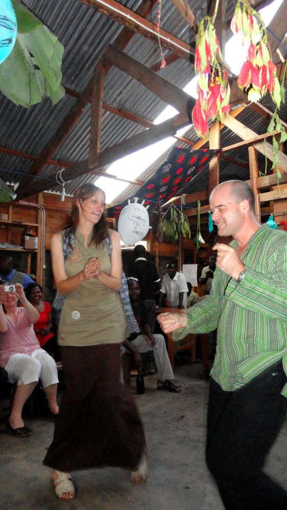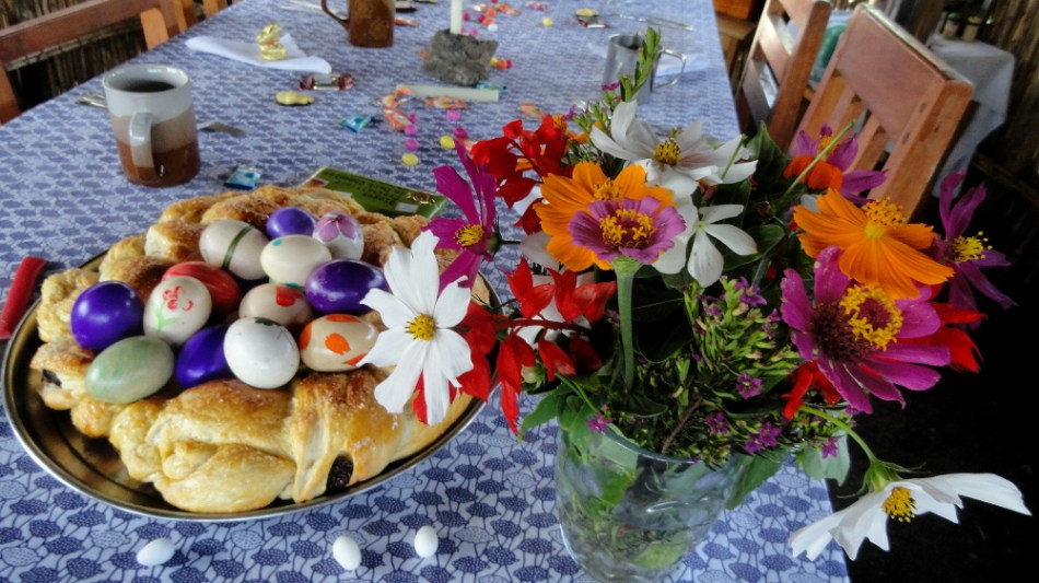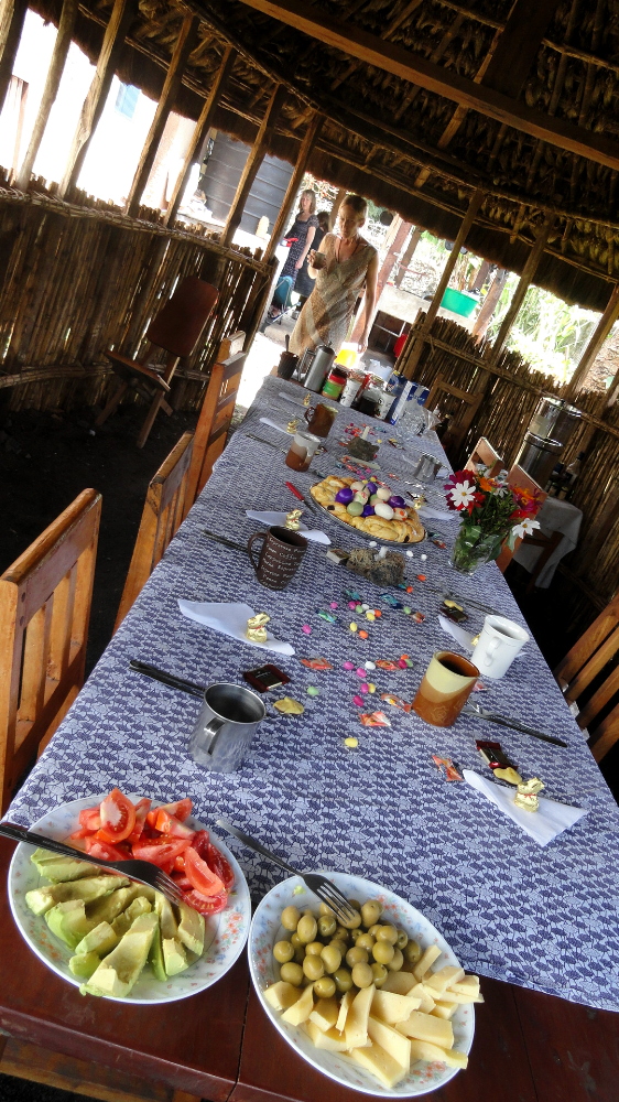 If the workload is too heavy, I might actually spend middle o’ day working, but I try to wall Sundays off and not even enter the office once. Then in the afternoon I’ll grab the sheers and fill a basket with what looks good in the garden, then start cooking. Usually Carla will help me chop and peel, unless she’s in the operating theater. Usually others will be playing cards or listening to music on the other side of the porch; and if I can, I’ll join them. Or we’ll all play a game of Risk. Then, when the food’s ready, we light some candles in the paillotte (two photos of it all decked out for easter brunch in the same set as the porch photo) and settle in for dinner. Sometimes after that comes a movie, or a campfire; sometimes it’s back to the card games or Risk or just off to read and relax before bed. Then, the next day, the work week starts up again and before you know it another week’s gone. And that, my friends, is how my past eight months have swept by rather like a river in flood – amazing, overwhelming, intensely educational & rewarding, and really rather exhausting. Hope you enjoy the photos. If all goes as planned, I’ll have a bit less than two months to go still in Mweso after I return; and with any luck, I’ll return from this vacation with more than enough energy to have a strong finish. Let’s hope so. :-).