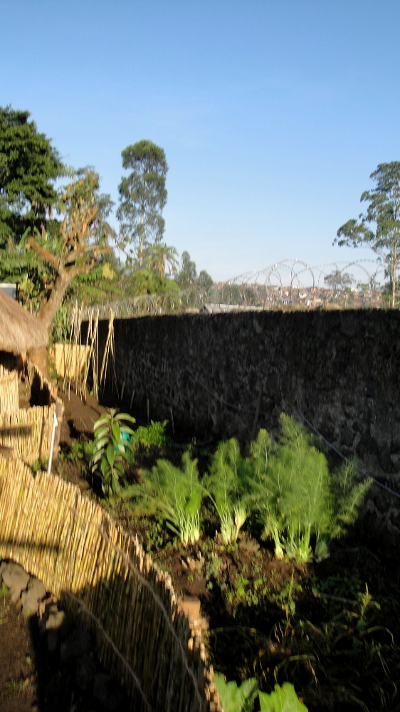Above: a lovely sunrise view of the front door to our compound and the hills to the west; below, part of our garden (we grow lots of our own vegetables and of our newest expat arrivals brought kale and sugar-snap pea seeds!), and if you look through the fuzzy focus (sorry) you can see some hill in the background and might make out some of the huts from the IDP camp on the hill up there.