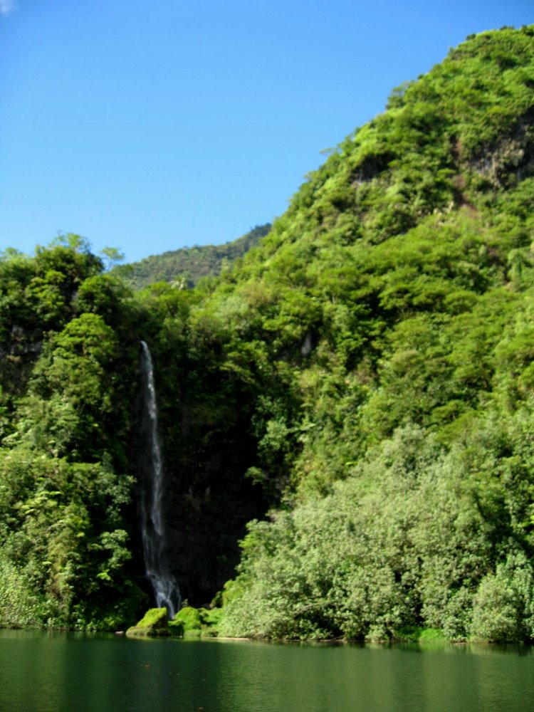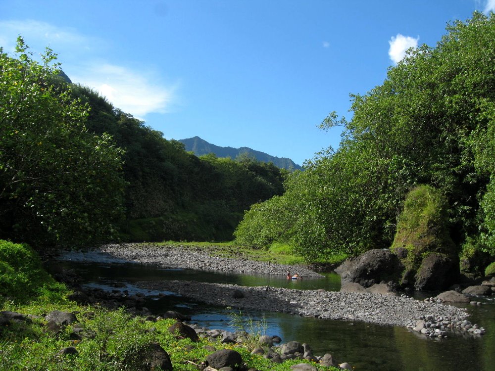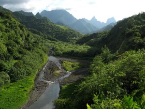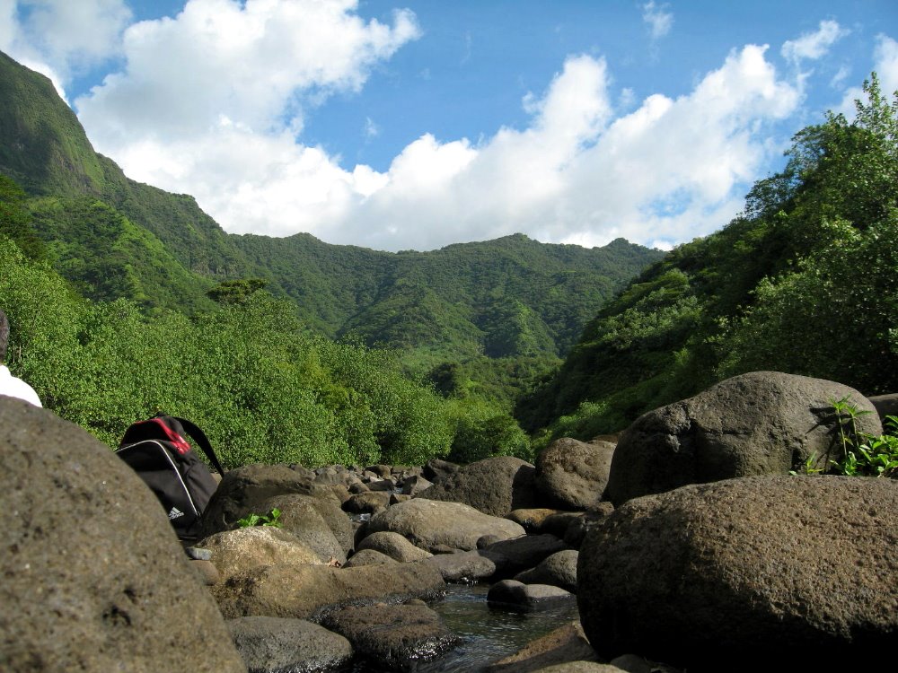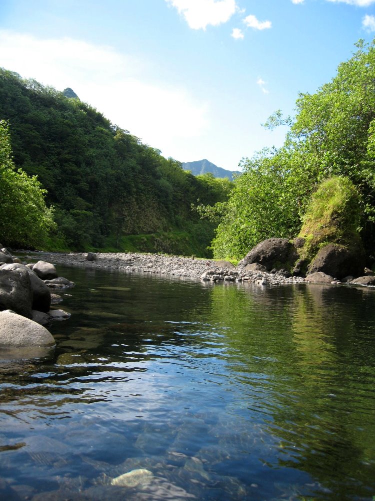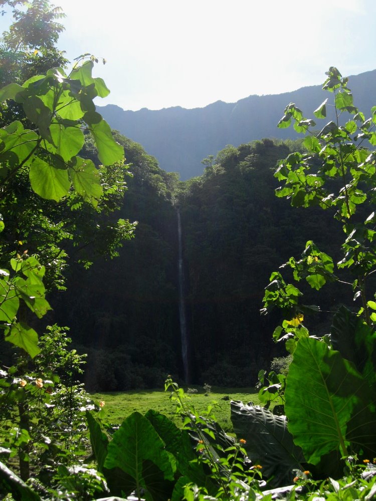 Having only a short time – December 31 and January 1, to be precise – I had just time to take a quaint little bus into the capital, Papeete to explore a bit, then hop a 4wd vehicle for a trip up the principal river valley on this volcanic island with two main portions, formed – like Maui, I presume – by two different volcanoes over the millenia. All of the lovely waterfall and moutnain valley shots are from that half-day trip; the others are from my walks around town, except the sunset beach shots looking out at Moorea (next-door island) and the high-up shot of turquiose water, which came from a walk in the hills above my hotel on new year’s day, where I found myself walking past the University of French Polynesia.