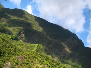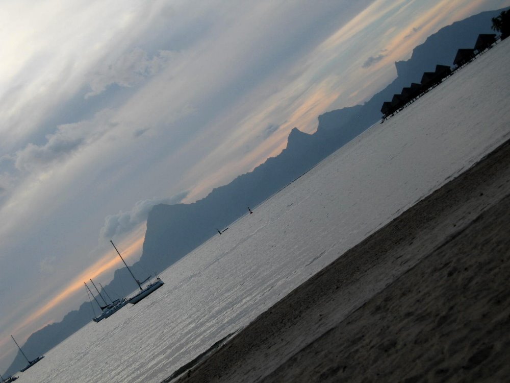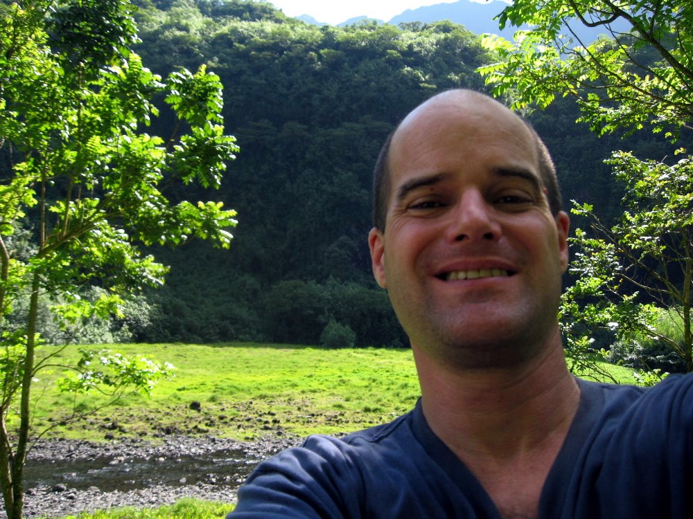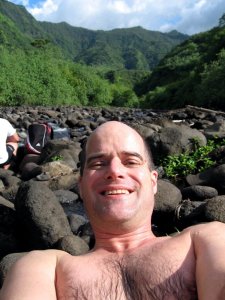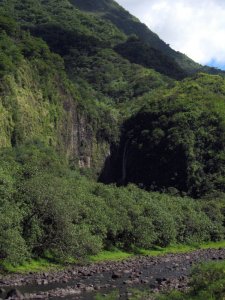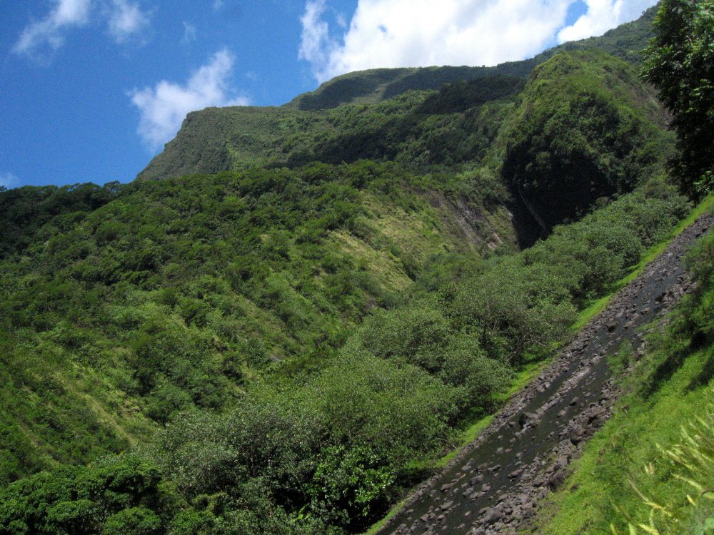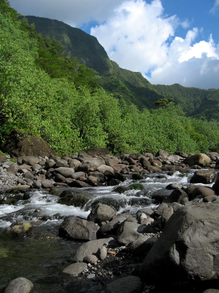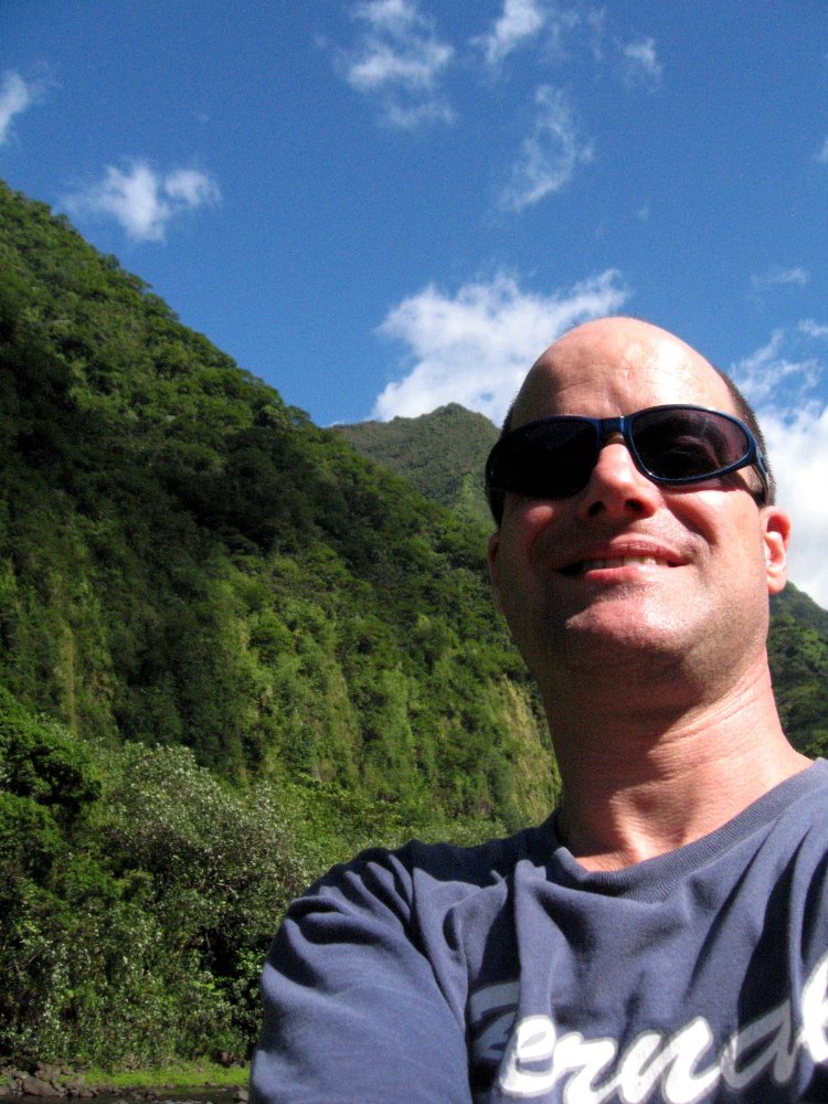Having only a short time – December 31 and January 1, to be precise – I had just time to take a quaint little bus into the capital, Papeete to explore a bit, then hop a 4wd vehicle for a trip up the principal river valley on this volcanic island with two main portions, formed – like Maui, I presume – by two different volcanoes over the millenia. All of the lovely waterfall and moutnain valley shots are from that half-day trip; the others are from my walks around town, except the sunset beach shots looking out at Moorea (next-door island) and the high-up shot of turquiose water, which came from a walk in the hills above my hotel on new year’s day, where I found myself walking past the University of French Polynesia.
