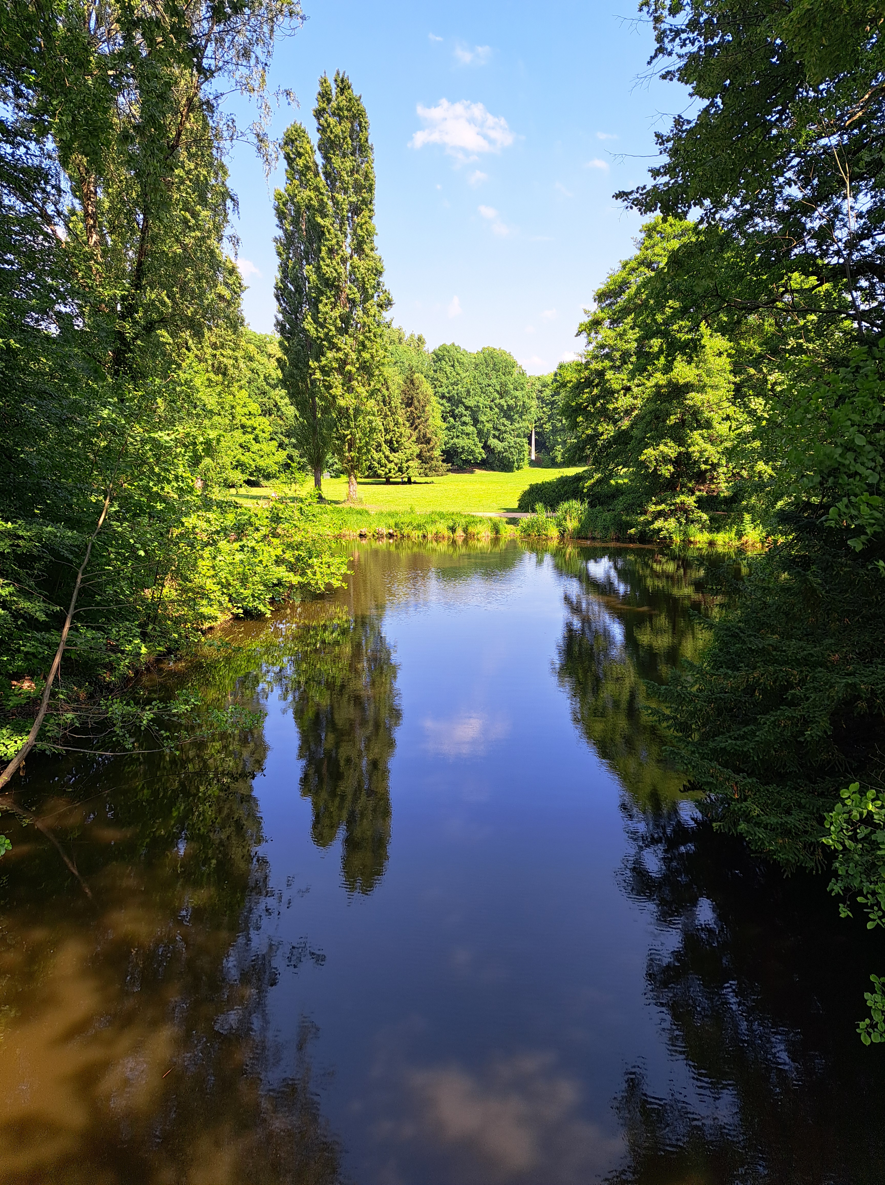 Above left: the bridge depicted in the movie “Bridge of Spies” along with another view from Steve’s and my cruise on June 1. Below, from Pfaueninsel looking over to the shores of Brandenburg. Back in the day, the W/E German border ran down the middle of that water.