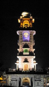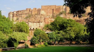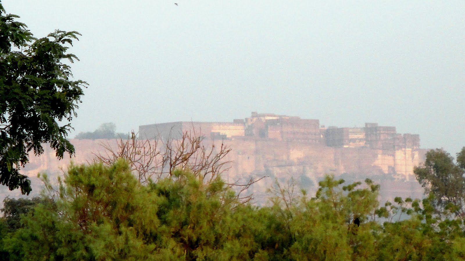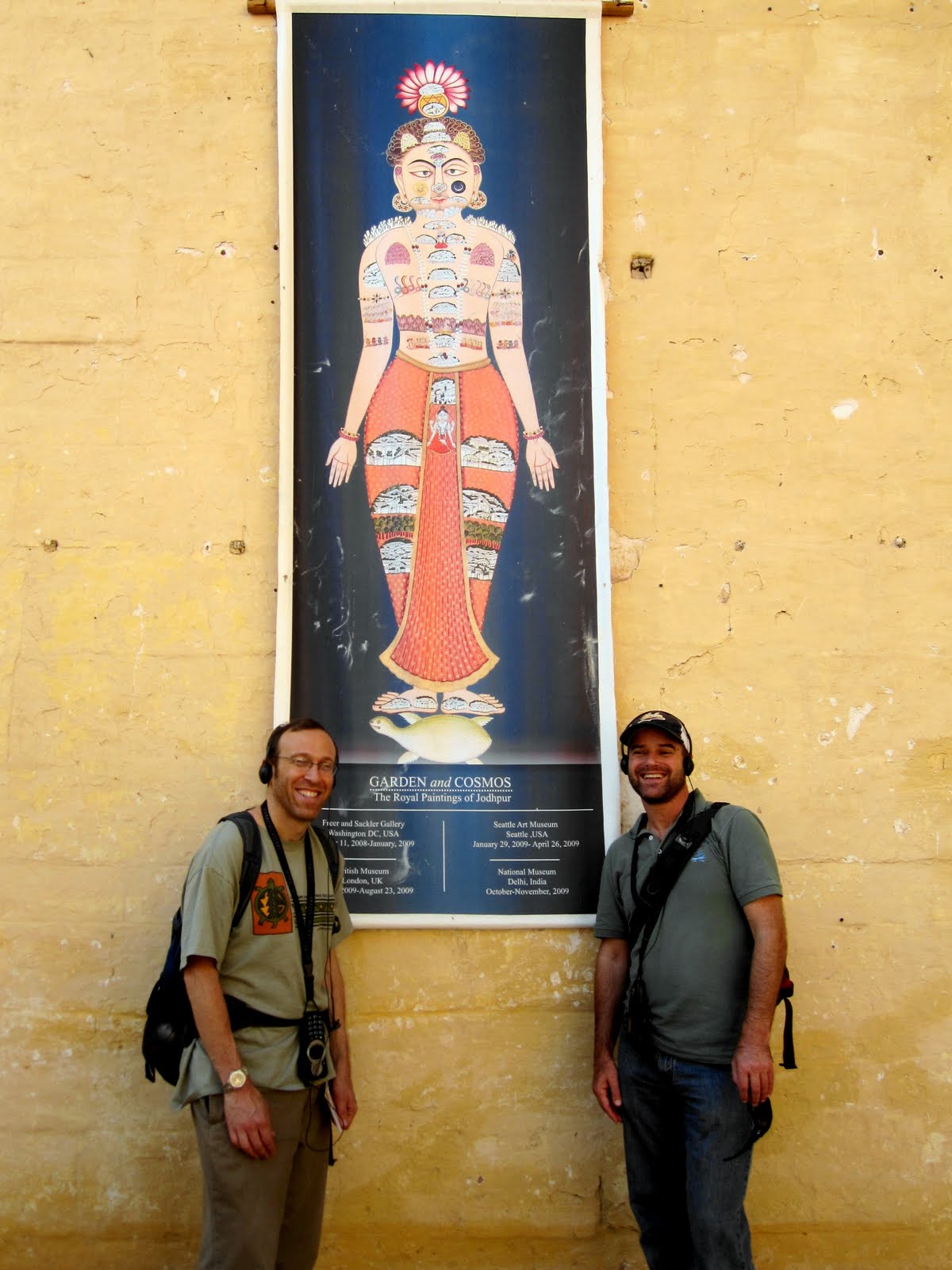 At the center of the modern state of Rajasthan, on the eastern edge of the Great Thar Desert, lies Mehrengarh Fort surrounded by the blue city within the outer walls. Our travel books were quite correct when they told us that the Fort is magnificent – rising high above the surrounding city and plain, a beautiful and impenetrable fort that never once fell to an enemy army during centuries of Rajput fighting outsiders, and Rajput fighting Rajput. Sadly, after taking the first photo you see above, the battery in my camera died. I did borrow one of Gene & Howard’s cameras and seem to recall taking jillions of photos of the opulent and beautifully-decorated rooms and battelements throughout the palace. At the very end, Gene ensured I had their cameras to take photos, but by then my camera complication at Jodhpur had faded into the past after all those gorgeous experiences in Jaisalmer and Udaipur that you’ve been seeing…and so I only took those shots of myself or us that looked good: e.g. Howard and me by the art-exhibit poster below.Oh well: take it as stated that the interior of the fort & palace is as impressive and beautiful as the exterior. And enjoy the shots that I took on an afternoon return trip, post-Jaisalmer, of the battlements and gardens at Mehrengarh. Though they already had the spectacular Fort, this particular royal family decided to build themselves an even more opulent and sumptuous palace called Umaid Bhavan – no military fort, this confection built in the 1930s as a ‘public works program’ for the waning days of British colonial rule in India. This is the palace I mentioned in my comments up above about the tension in my own mind between the beauty of these buildings and their history, and the enormous social inequality and maldistribution of resources that they represent. It’s good for Americans to be reminded that, in this epoch on the global scale, we’re the modern equivalent of these Rajahs building themselves pleasure palaces while the poor are starving. Not a sustainable system, my friends.