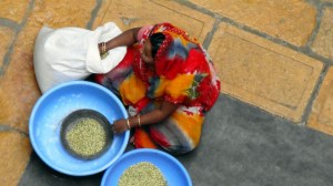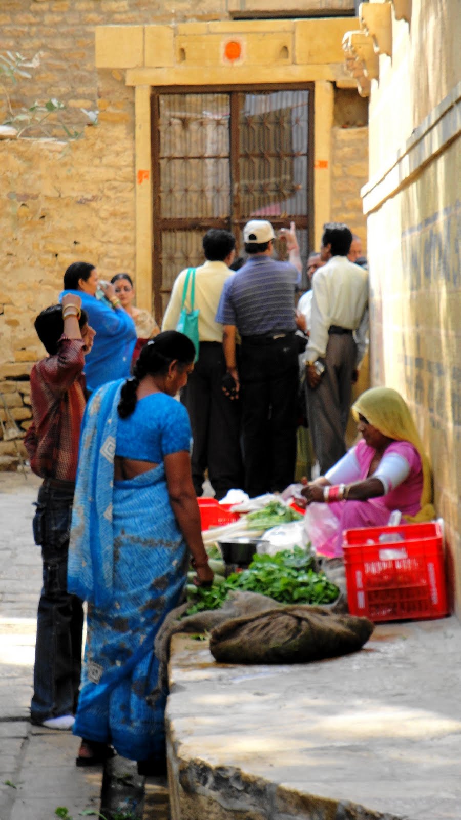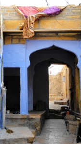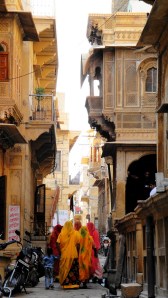 But for some reason I suspect these aren’t the images that will evoke my own memories years from now. I think – I hope – that those will be the more life-sized memories, like the camel’s swish. Already I think of the rows of women and men on the winding back roads we drove through the Aravalli Hills balancing enormously outsized bundles of dried stalks (corn stalks? I think?) on their heads — though obviously light since they were dried stalks of a lovely tan color, standing out nicely against the often colorful saris of the women and turbans of the men, these bundles were really quite enormous, perched there on people’s heads. Since all we did was drive past dozens of such pedestrians as we rattled along the bumpy hill roads from Jodhpur to Udaipur, I never had a chance to take any photos but I suspect the images will linger. Or the round earthen huts with conical roofs of branches and thatch, dotted around the Thar Desert countryside before Jaisalmer — usually with a few scattered camels munching from trees (you never imagined that camels can look almost like giraffes when they eat chew on a tree, did you?) as well. Repeated swerving to avoid not only jillions of motorbikes and motorcoaches and cows crossing, but camels as well. These and other impressions – dusty dryness, bumpy roads, dodging cow pies on the streets of every town we’ve walked through, fending off touts and endless streams of children who wanted nothing more than to repeat hello and ask ‘where you from?’ a few million times as we wandered the back streets of Old Jaisalmer below the fort…these images will have to live in my memory since most of my photos were devoted to the more typically touristic and photogenic themes.